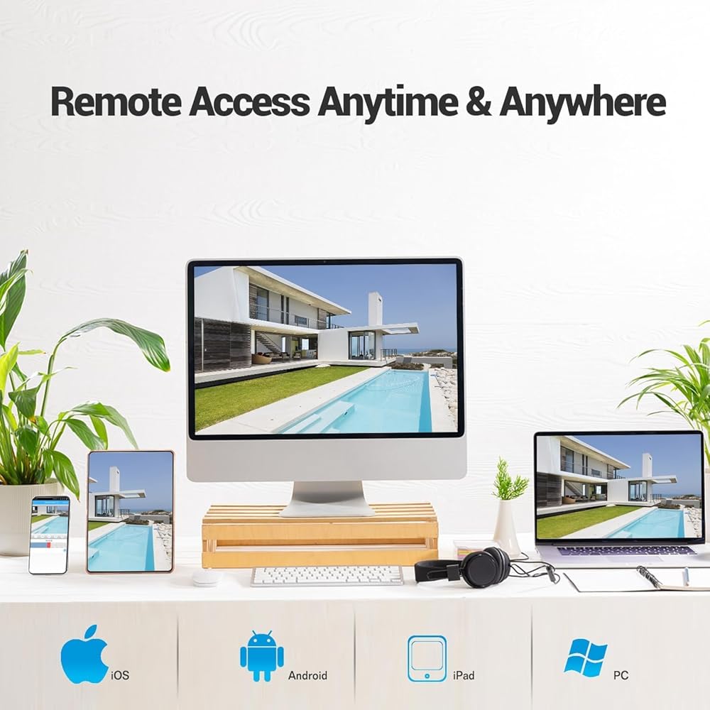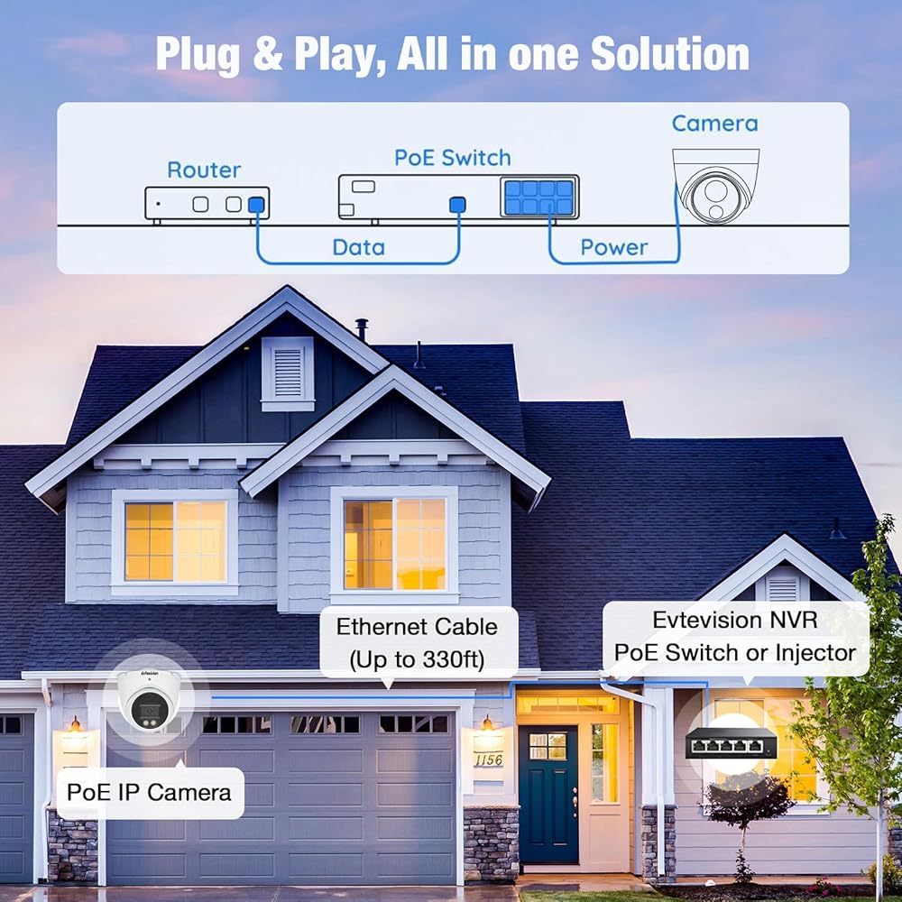 إعداد التوصيل والتشغيل PoE - تحتاج كاميرا الأمان PoE بدقة 4 ميجابكسل هذه إلى كابل إيثرنت واحد فقط للاتصال بـ NVR لنقل البيانات والطاقة. (مصدر الطاقة غير متضمن.) بفضل سهولة تركيبه، يمكنك وضعه في المرآب أو الباب الأمامي أو المتجر، وما إلى ذلك، كما تريد. التوصيل والحماية بهذه السهولة.