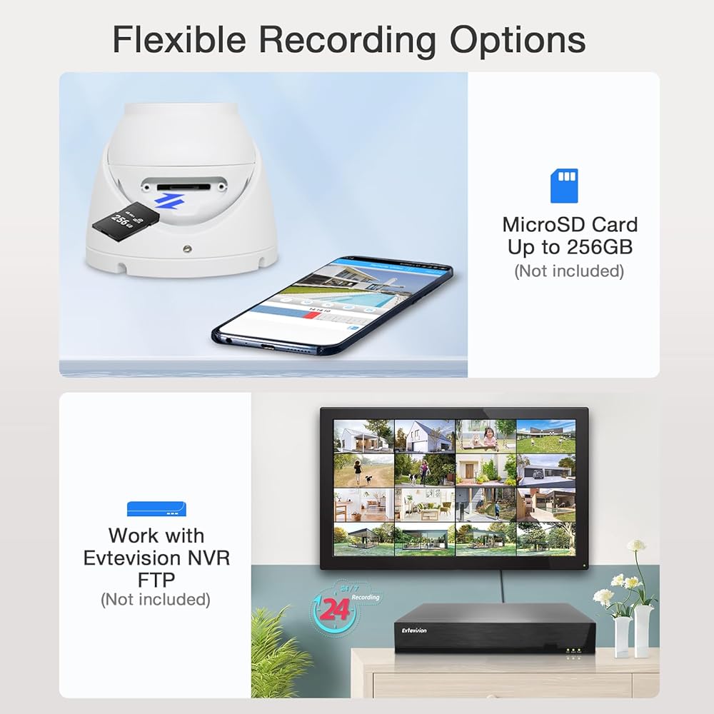 تدعم بطاقة Micro SD / تخزين NVR - تسجل كاميرا الأمان الخارجية IP هذه 24/7 أو مقاطع الفيديو التي تثير الحركة عبر بطاقة microSD (حتى 256 جيجابايت، غير متضمنة) أو NVR. تعمل Evtevision NVR بشكل أفضل مع هذه الكاميرا الخارجية، حيث يتيح ترميزها الفريد H.265+ تسجيلًا أطول واستهلاكًا أقل لعرض النطاق الترددي دون فقدان جودة 4 ميجابكسل. (4K NVR: B08JPW1MQT,B08Q2YNT8Y,B07B3RHKG5)