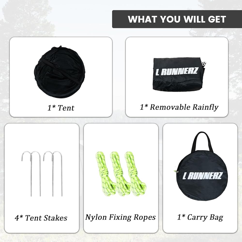التجميع بسهولة - يمكن تركيب خيمة التخييم في 10 ثوانٍ. مع رمية سريعة وبضع خطوات بسيطة، ستظهر خيمة التنزه سيرًا على الأقدام وستكون جاهزة للاستخدام. ما عليك سوى تثبيت الزوايا الأربع على الأرض، وستكون جاهزًا للبدء في مغامرتك الخارجية!
