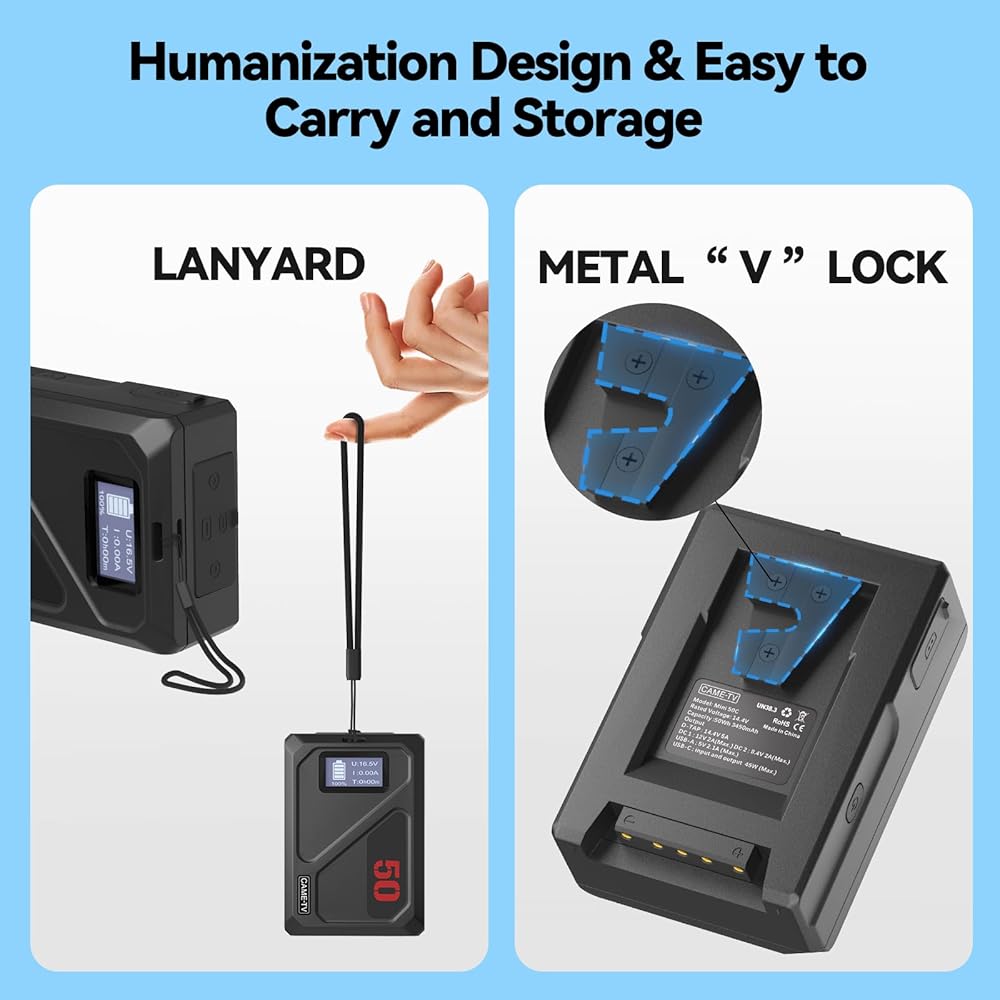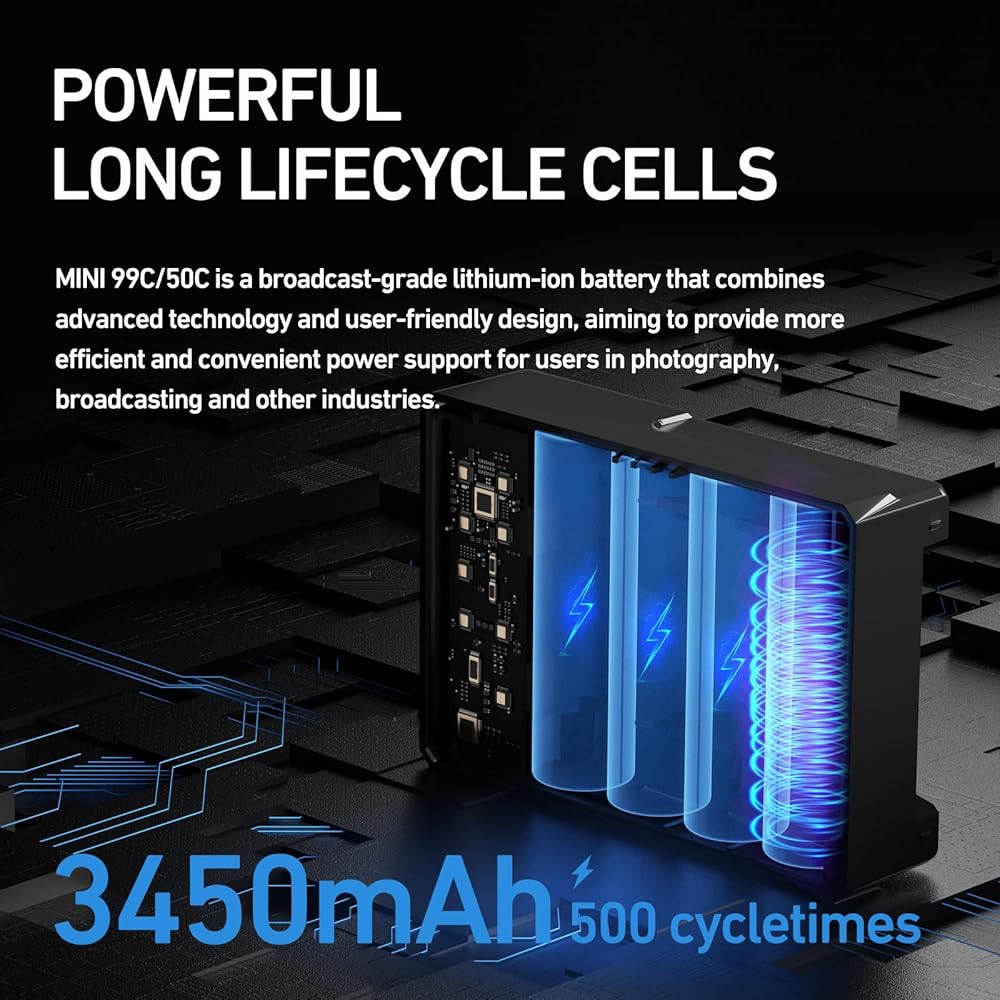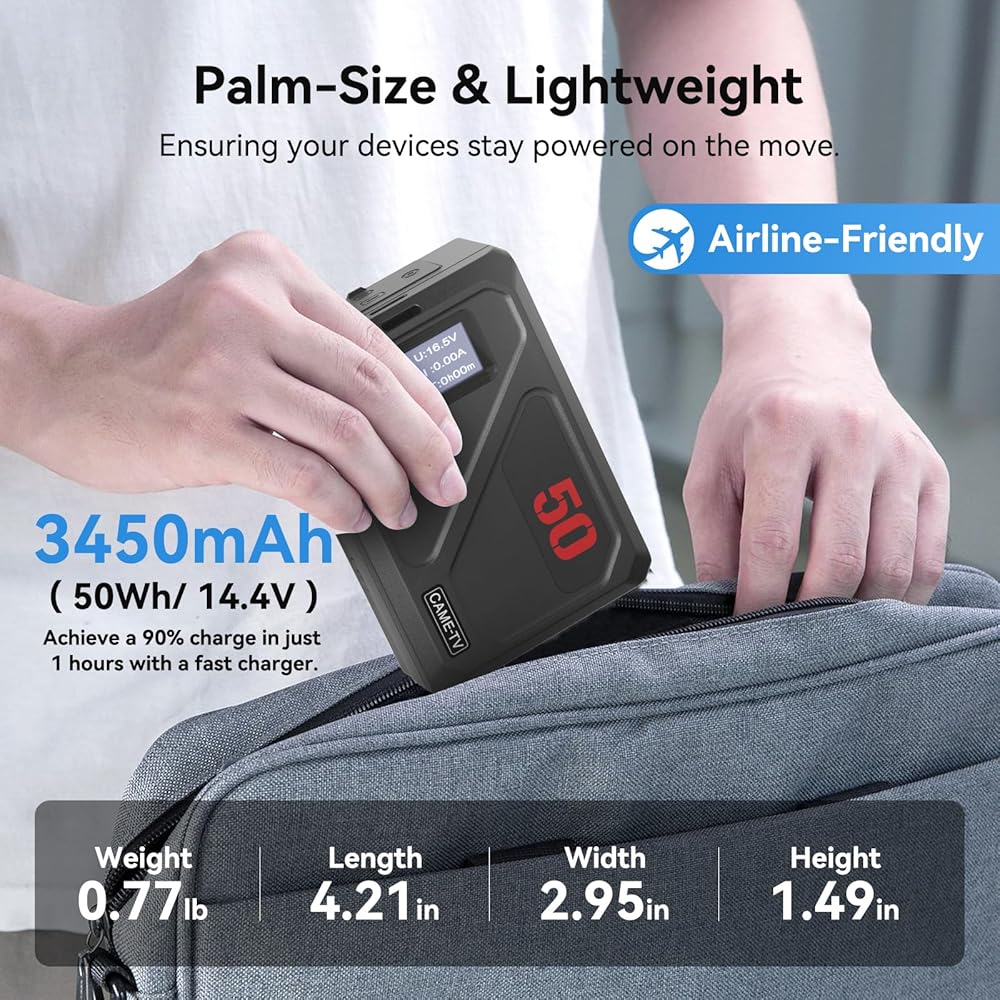 【حجم صغير وصديقة للطيران المحمولة】 توفر بطارية V-lock حلاً جيدًا للطاقة الاحتياطية للمصور وعشاق السفر وصانعي الأفلام. الأبعاد فقط 4.2 بوصة × 2.95 بوصة × 1.49 بوصة وتزن 0.35 كجم، تصميم بحجم كف اليد لجهاز MINI 50C v - بطارية مثبتة تجعل من السهل تخزينها في حقيبة الظهر اليومية أو حقيبة السفر ولا تضيف أبدًا كميات كبيرة إلى أمتعتك، فهي توفر إمكانية حمل ممتازة ويمكن حملها على الطائرات، مما يضمن إمكانية اصطحابها معك أينما ذهبت دون أي قيود.