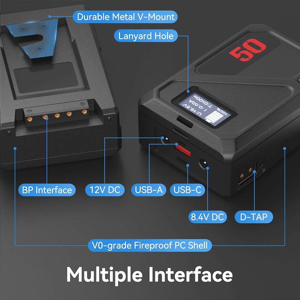 بطارية متعددة الواجهات على شكل حرف V توفر بطارية Mini V Mount بقدرة 3450 مللي أمبير في الساعة مجموعة واسعة من الواجهات. تتضمن واجهات BP وUSB-A وD-TAP ومنافذ USB-C ثنائية الاتجاه التي تدعم ما يصل إلى 45 وات PD 2.0 و3.0 مدخلات ثنائية الاتجاه/ الإخراج، بالإضافة إلى واجهات 12 فولت تيار مستمر و8.4 فولت تيار مستمر للسماح لك بجعل تشغيل أجهزتك وشحنها أكثر ملاءمة، يتيح لك هذا التنوع تشغيل أجهزة مختلفة مثل الكاميرات والأجهزة اللوحية والهواتف الذكية والشاشات ومصابيح الفيديو LED والطائرات بدون طيار وأجهزة الكمبيوتر المحمولة كله مره و احده.