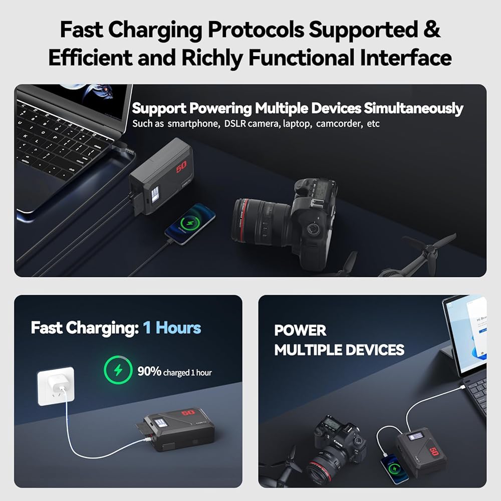 【شحن سريع ثنائي الاتجاه بقدرة 45 واط PD لمدة ساعة واحدة】بطارية تركيب Came-TV Mini 50C تدعم الشحن السريع للإدخال/الإخراج ثنائي الاتجاه PD 2.0 و3.0. يمكن لمنفذ Type-C توفير شحن سريع بحد أقصى 45 وات PD للهواتف الذكية وأجهزة الكمبيوتر المحمولة ومعدات التصوير الفوتوغرافي والأجهزة الأخرى. متوافق مع الكاميرات التي تستخدم بطاريات V Mount / V Lock القياسية.