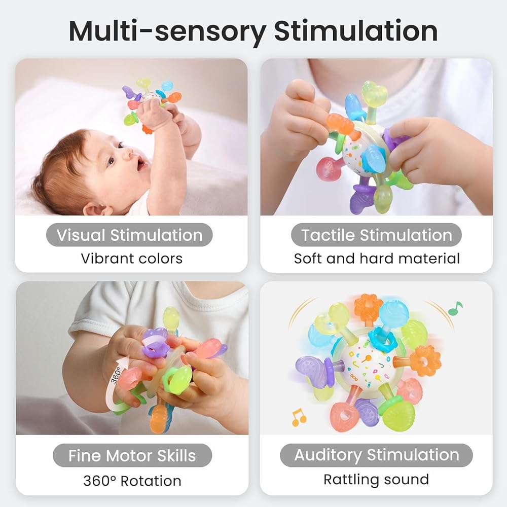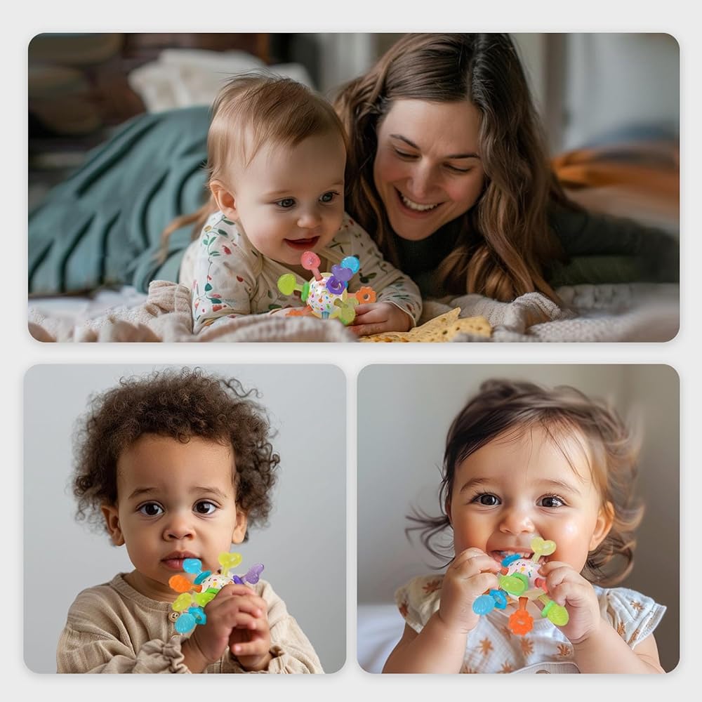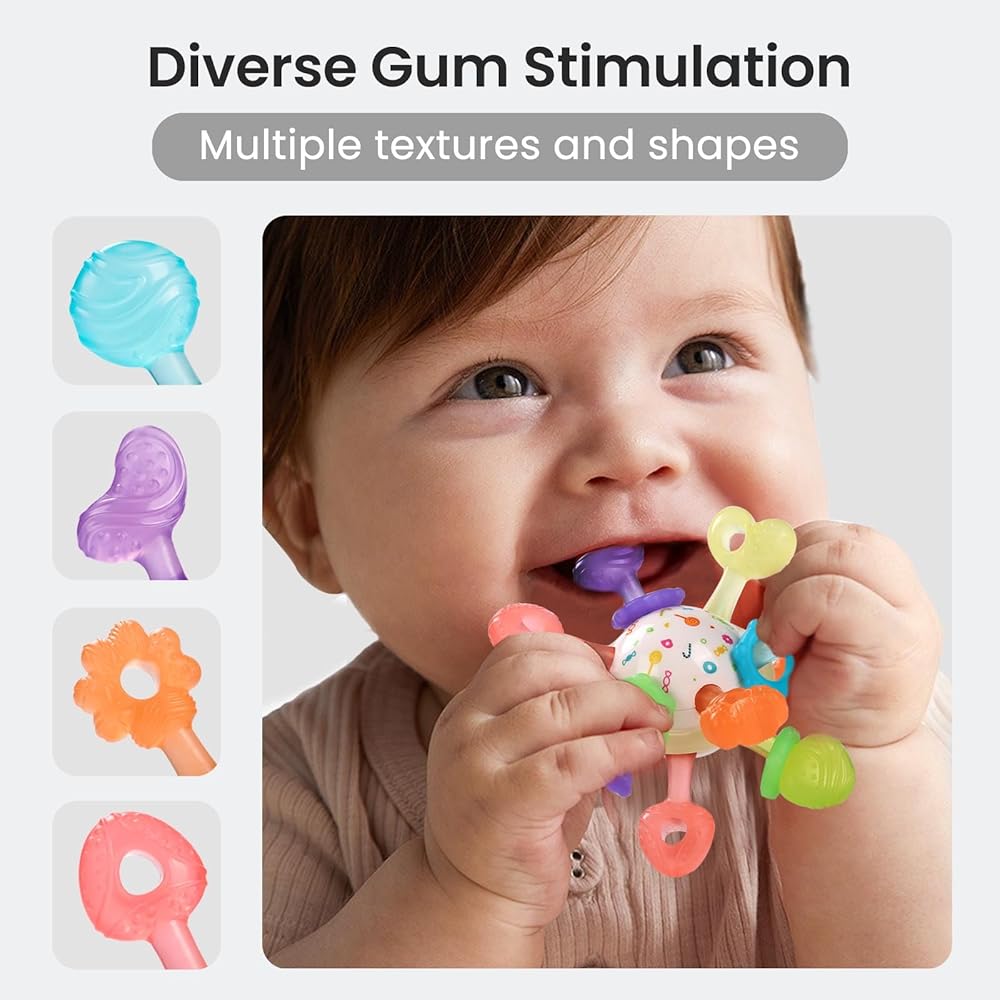 【تحفيز مختلف للثة】مقارنة بألعاب التسنين العادية ذات النسيج الواحد، تتميز عضاضتنا بمجموعة متنوعة من الأشكال والأنسجة، مما يوفر للأطفال تحفيزًا متنوعًا للثة خلال المراحل المختلفة من التسنين. مصنوع من السيليكون الناعم، وهو مصمم ليكون لطيفًا على اللثة، ويوفر راحة مهدئة مع تعزيز النمو الصحي للفم. ضروري للأطفال الذين تتراوح أعمارهم بين 0 إلى 12 شهرًا.