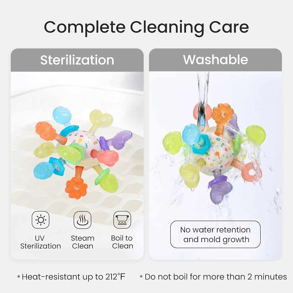 【العناية بالتنظيف الكامل】يمكن شطف لعبة عضاضة الأطفال الخاصة بنا بسهولة بالماء، والكرة المركزية محكمة الغلق تمنع احتباس الماء. مصنوعة من مادة مقاومة للحرارة، ويمكنها تحمل الغليان عند درجة حرارة 212 درجة فهرنهايت، مما يضمن تجربة مضغ نظيفة. يتم استكمالها بحقيبة تخزين لمنع الغبار والأوساخ، مما يجعلها مريحة للحمل. يرجى ملاحظة أن هذه العضاضة غير مناسبة للاستخدام في غسالة الأطباق أو الميكروويف، ويجب ألا يتجاوز الغليان دقيقتين.