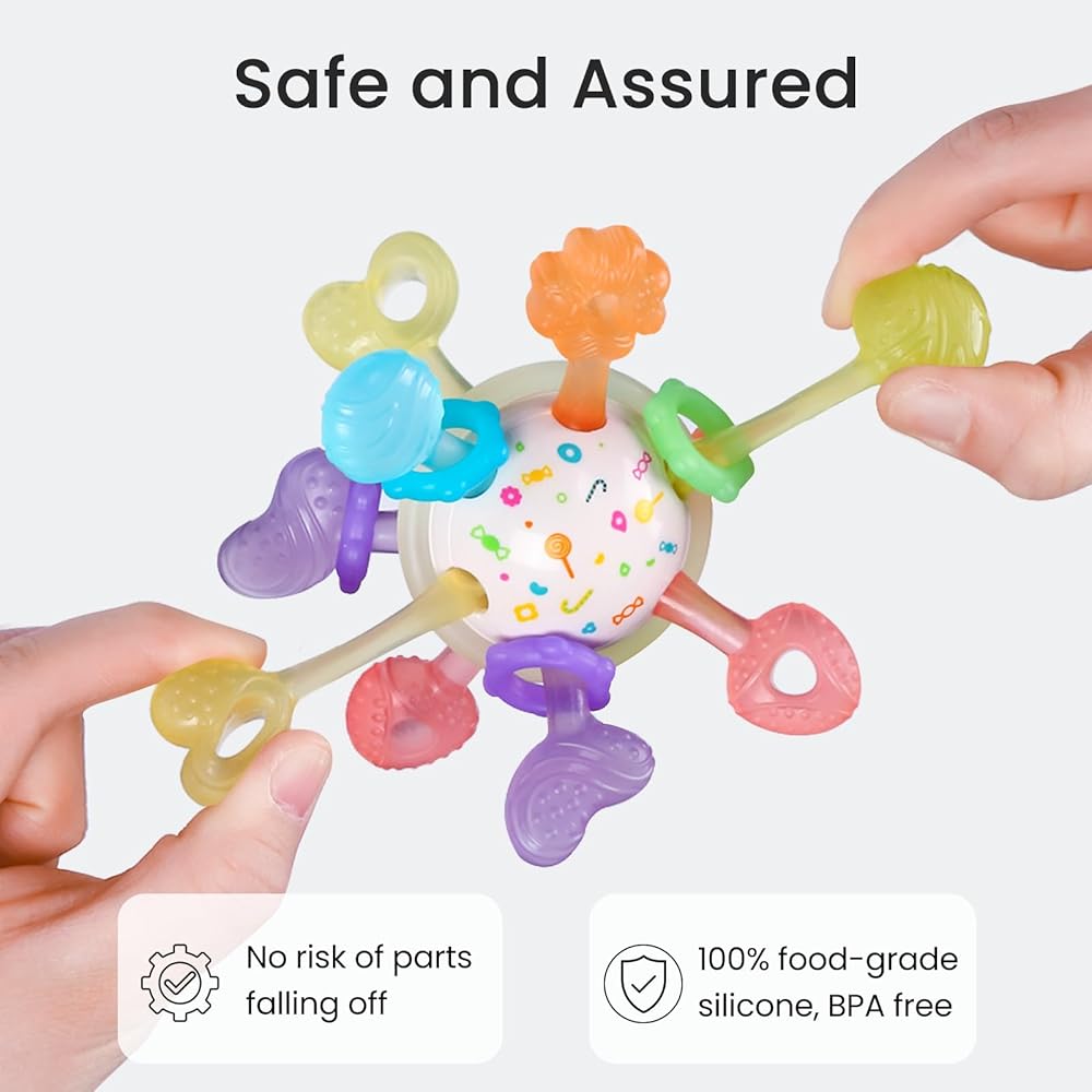 【آمن وآمن】كن مطمئنًا بشأن السلامة! مصنوعة من مادة السيليكون الصالحة للطعام بنسبة 100%، لعبة التسنين الخاصة بنا عديمة الرائحة وخالية من مادة BPA. علاوة على ذلك، فقد خضعنا لاختبارات السحب الصارمة للغاية لضمان عدم وجود خطر انفصال الأجزاء أثناء مضغ طفلك. تم وضع الخرزات بقوة داخل العضاضة ولن تسقط، مما يتيح لطفلك مضغها بثقة مطلقة.