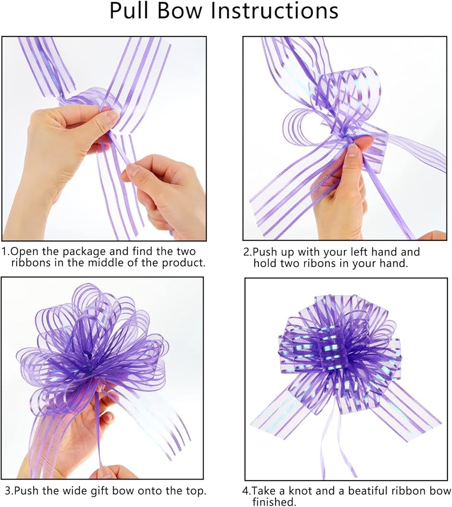 سهلة الاستخدام، ما عليك سوى سحب خيوط الشريط لتشكيل قوس جميل. طريقة الاستخدام: ابحث عن الجزء السفلي ← اقلب كلا الجانبين ← ابحث عن الشريط واستخدم إصبعين لضغط نهاية الشريط ← استخدم يدًا أخرى للدفع لأعلى على طول الشريط حتى يصبح قوسًا، اربط الخيوط عند الانتهاء، ثم اربط عقدة لتأمين المجموعة، ويمكنك ربط الأقواس بالهدايا