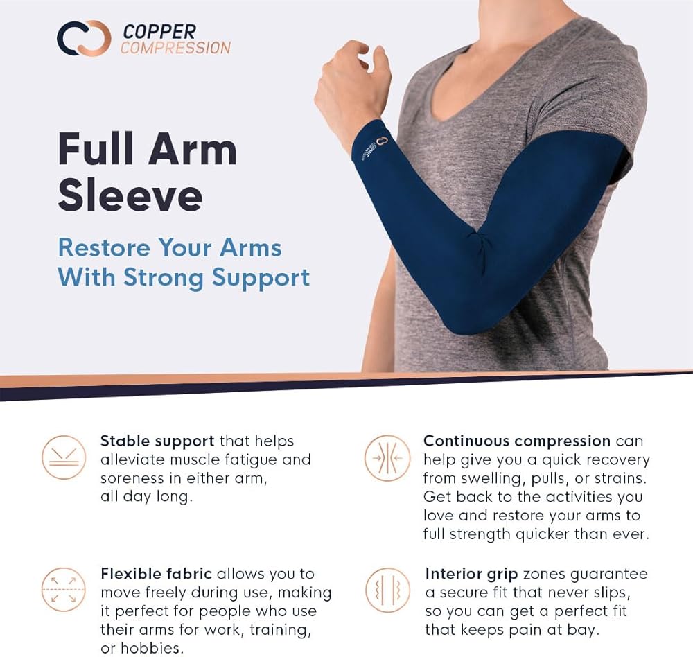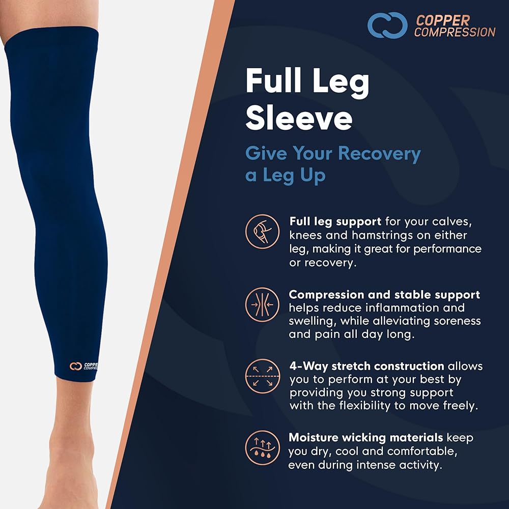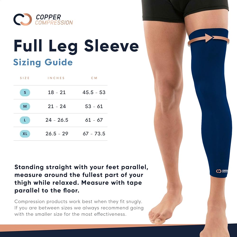ابحث عن القوة اللازمة للشفاء. توفر الأكمام الضاغطة النحاسية المريحة للغاية ضغطًا ثابتًا من أعلى الفخذ إلى أعلى الكاحل مباشرةً. المقاس الضيق يجعل من السهل ارتداؤه تحت السراويل والسراويل والتنانير وحتى السراويل الضيقة، دون إضافة حجم كبير. هذا لباس ضاغط لكامل الساق، ولا ينبغي طيه أو لفه عند ارتدائه. بالنسبة لاحتياجات الساق الجزئية، تحقق من أكمام الساق المخصصة للتعافي، وكم الركبة للتعافي، وكم الركبة PowerKnit.