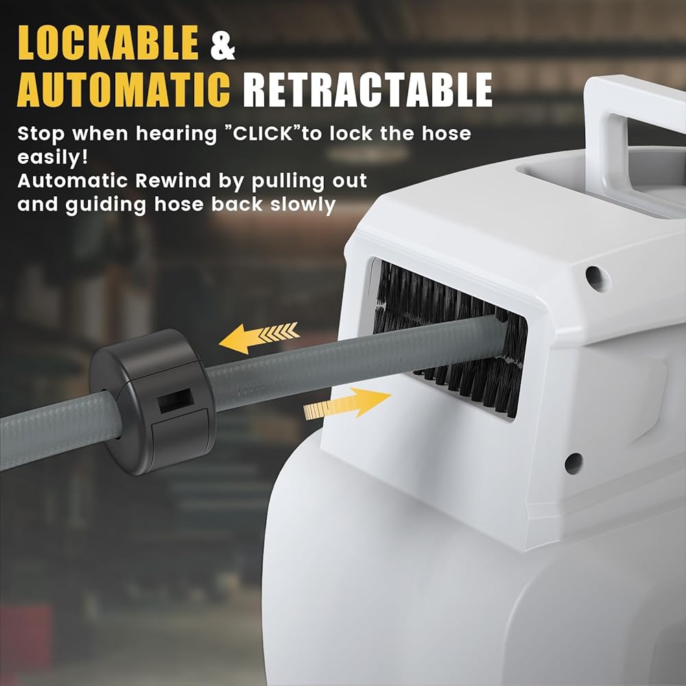 【سحب تلقائي خالٍ من التشابك وقفل لأي طول】تزود بكرة ضاغط الهواء القابلة للسحب من Taskstar بنظام توجيه فريد قابل للسحب، ويمكنها لف الخرطوم بدقة، مما يمنع الالتواء أثناء التمدد والانكماش. عندما تتوقف عن السحب للخارج وتسمع "نقرة"، فإنه يقوم تلقائيًا بقفل الخرطوم بأي طول حسب رغبتك. عند الانتهاء، اسحب للخارج برفق وسيرشدك النظام إلى سحب الخرطوم تلقائيًا.