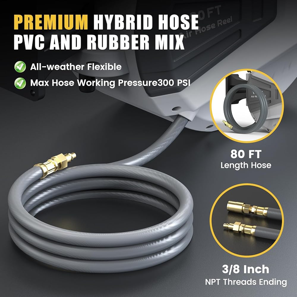 【تصميم متقدم】بالإضافة إلى هذه الميزات، تم تصميم بكرة خرطوم الهواء تاسك ستار أيضًا مع سدادة خرطوم قابلة للتعديل، ومقبض قابل للطي، ووصلة عالمية من النحاس الصلب المقاوم للسحق وبكرات غير قابلة للتمزق. لا يمكن لهذه التصميمات أن تعزز تجربتك فحسب، بل يمكنها أيضًا إطالة عمر بكرة خرطوم الهواء 3/8.