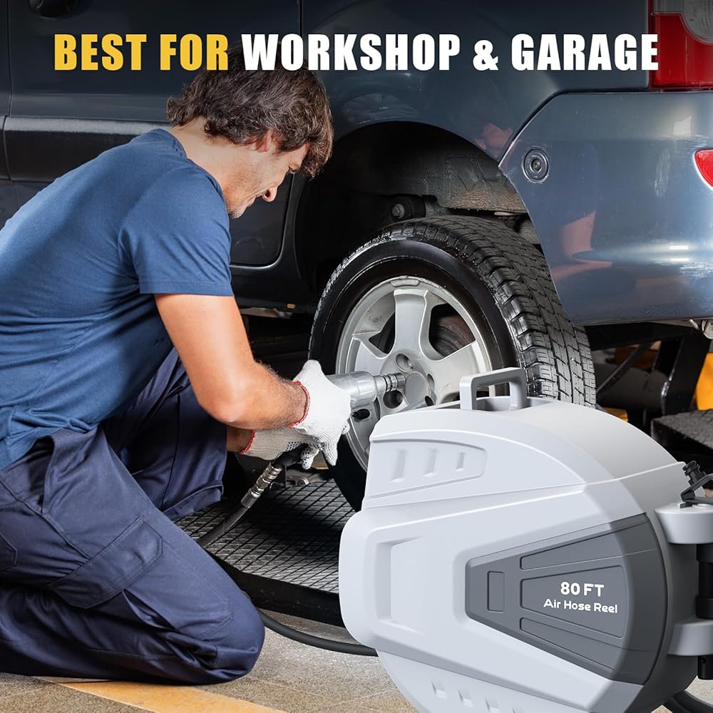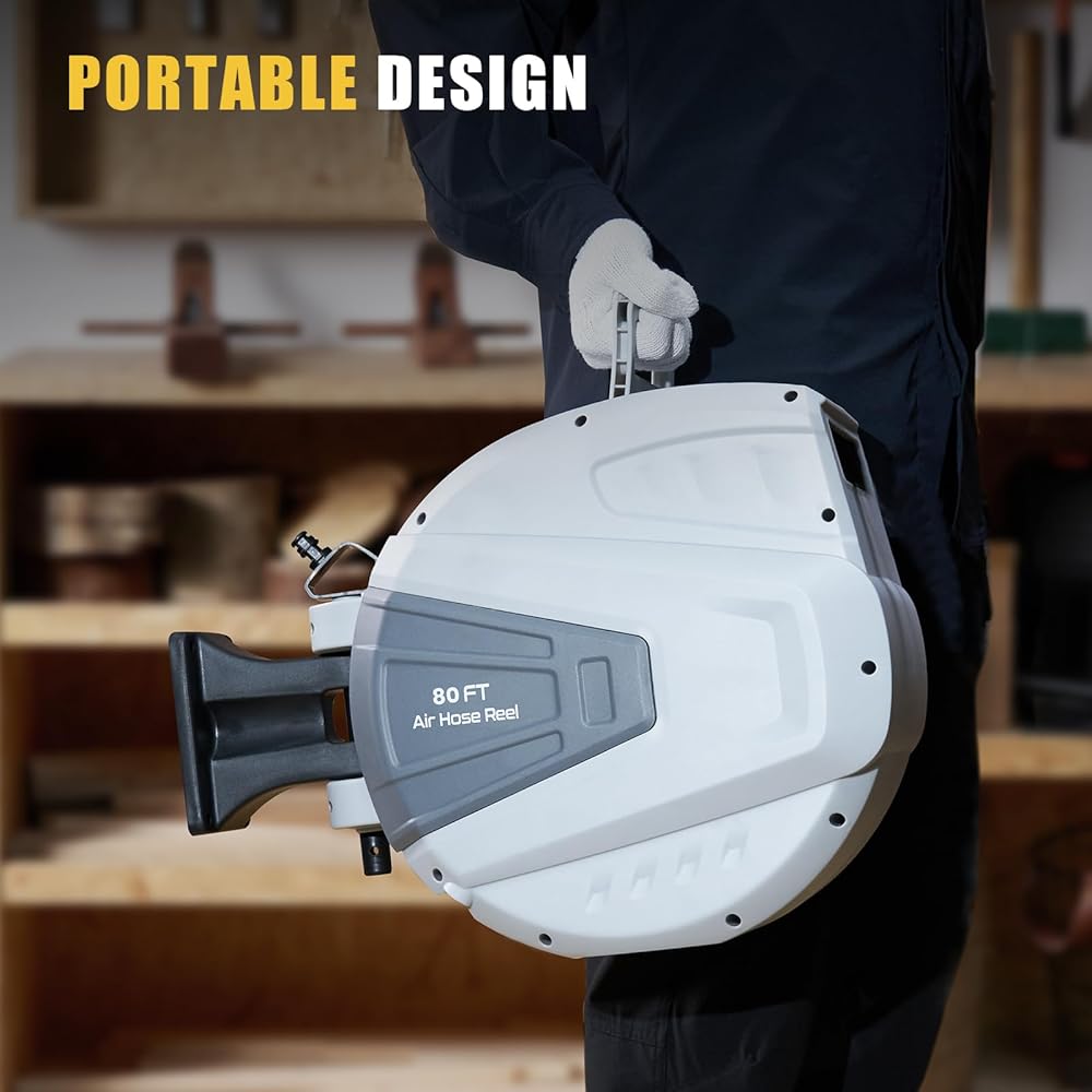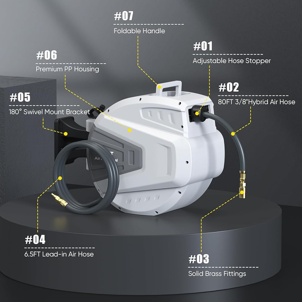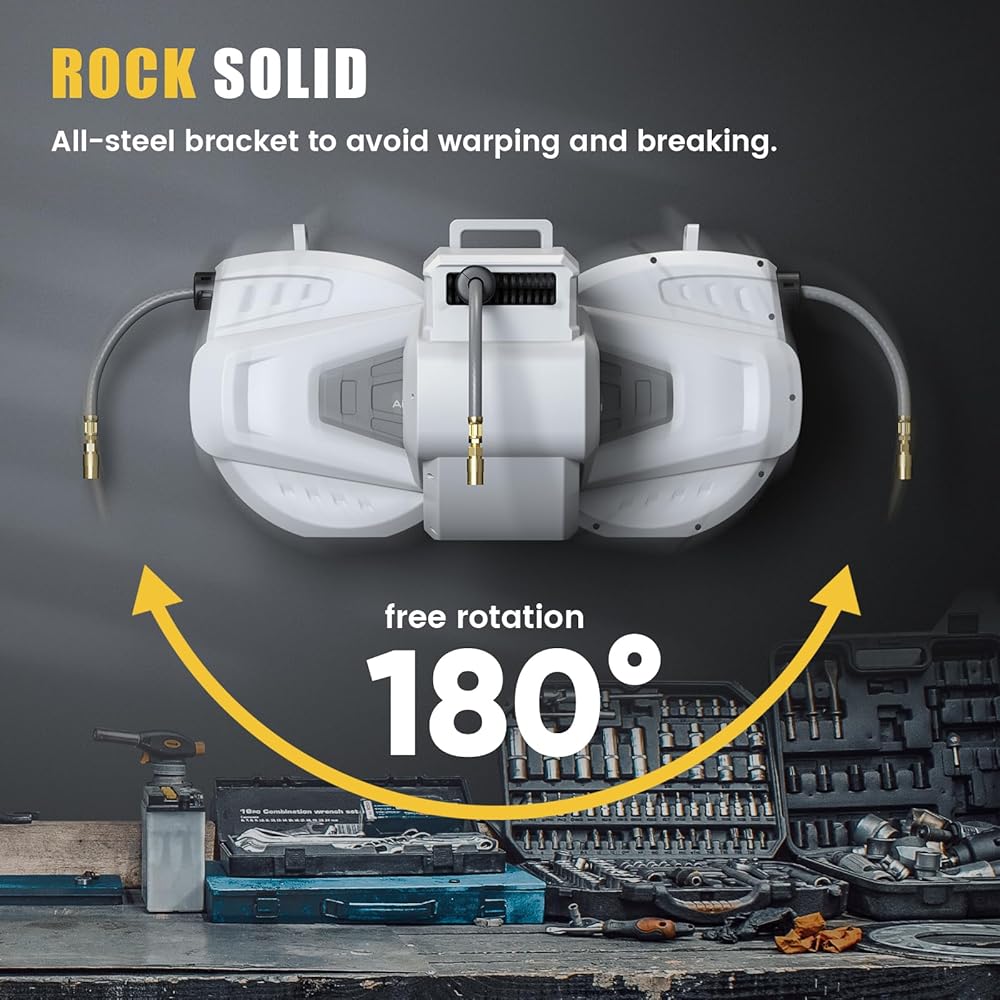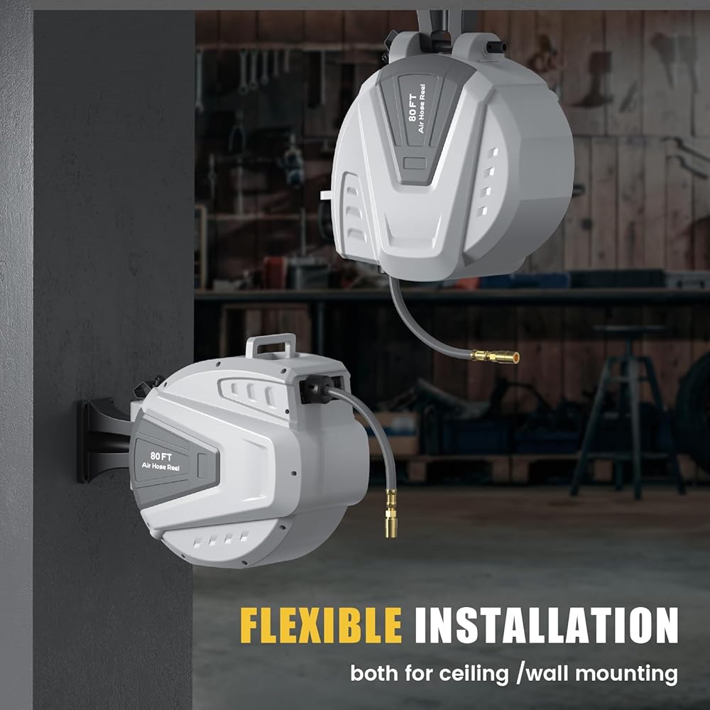 【سهلة التركيب】يمكن تركيب بكرة خرطوم ضاغط الهواء شديدة التحمل على الحائط أو السقف باستخدام دعامة دوارة 180 درجة وبعض البراغي التي قمنا بإعدادها لك، مما يسمح بدوران حر 180 درجة ليمنحك تجربة تمدد مريحة ونطاق أكثر شمولاً. من الاستخدام. مع نظام التحرير السريع، يمكنك أيضًا رفع المقبض بسهولة لإزالة بكرة خرطوم الهواء للتخزين.
