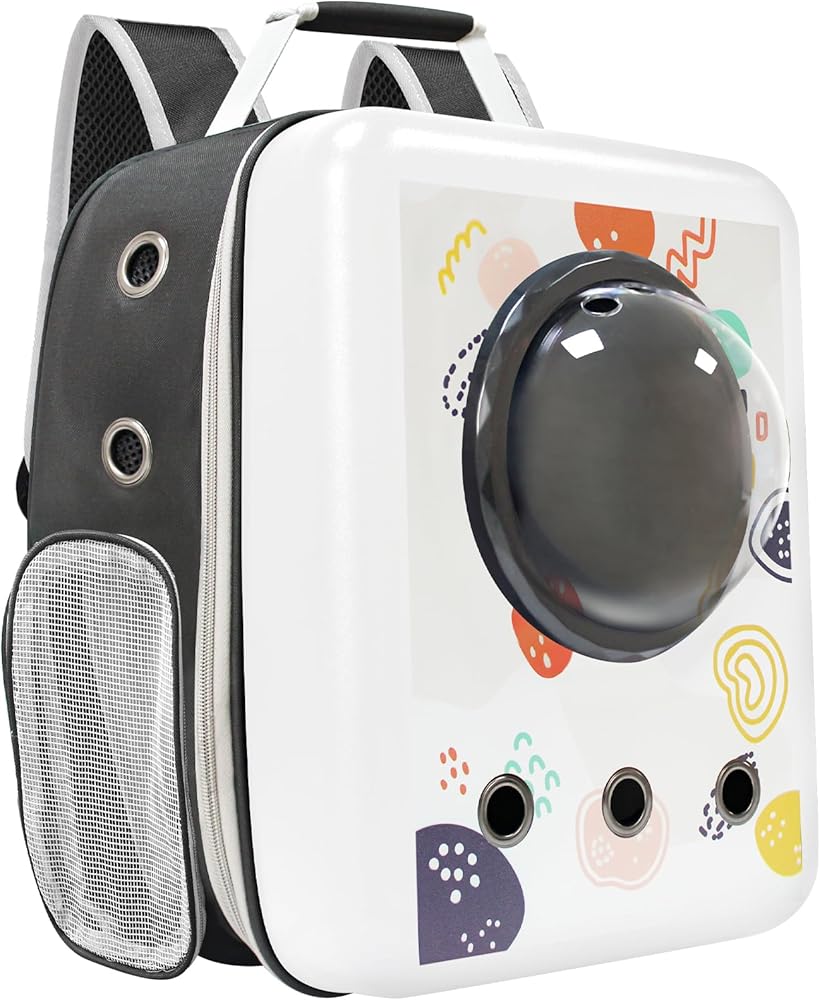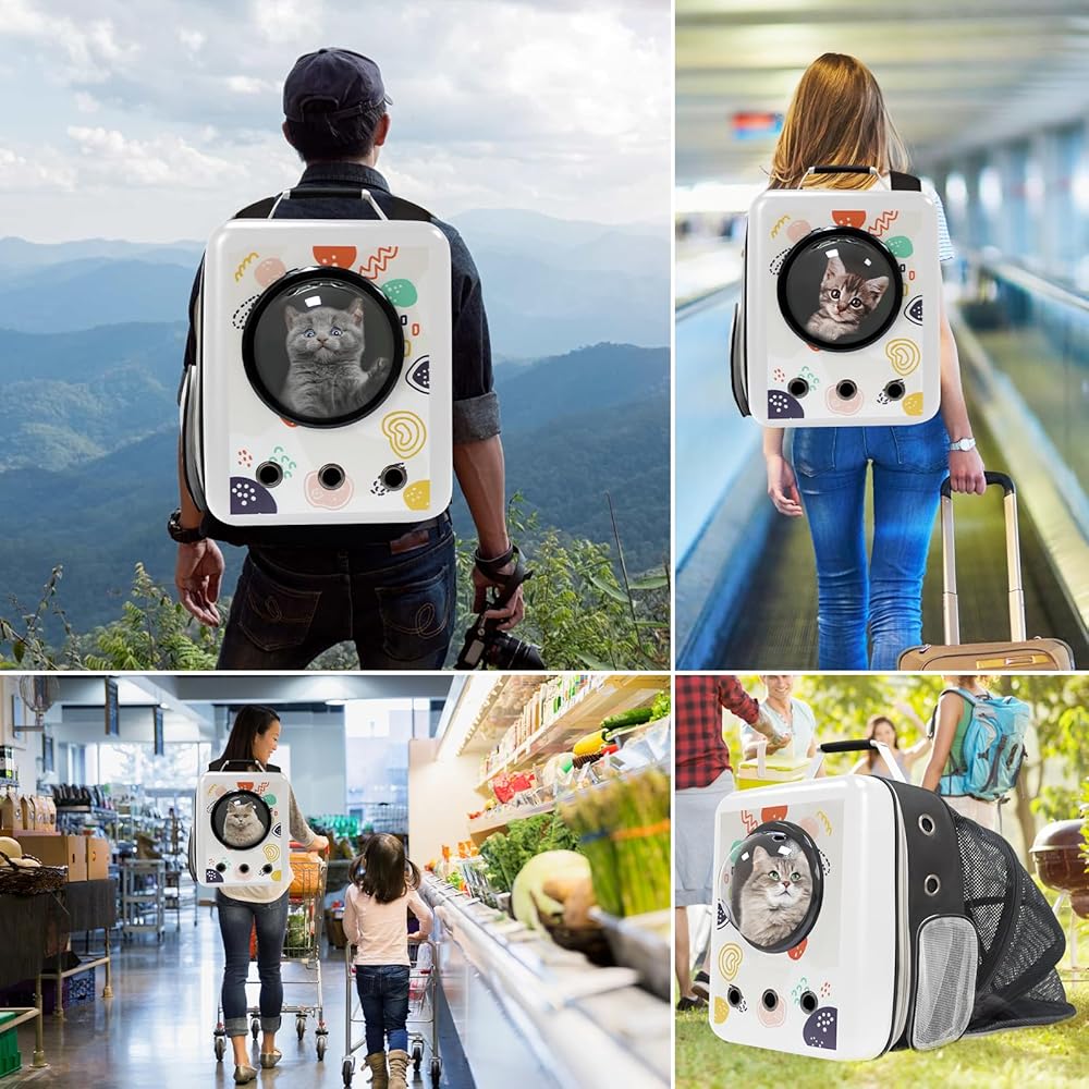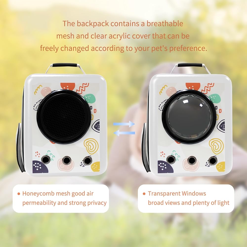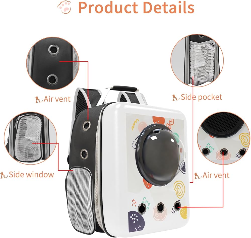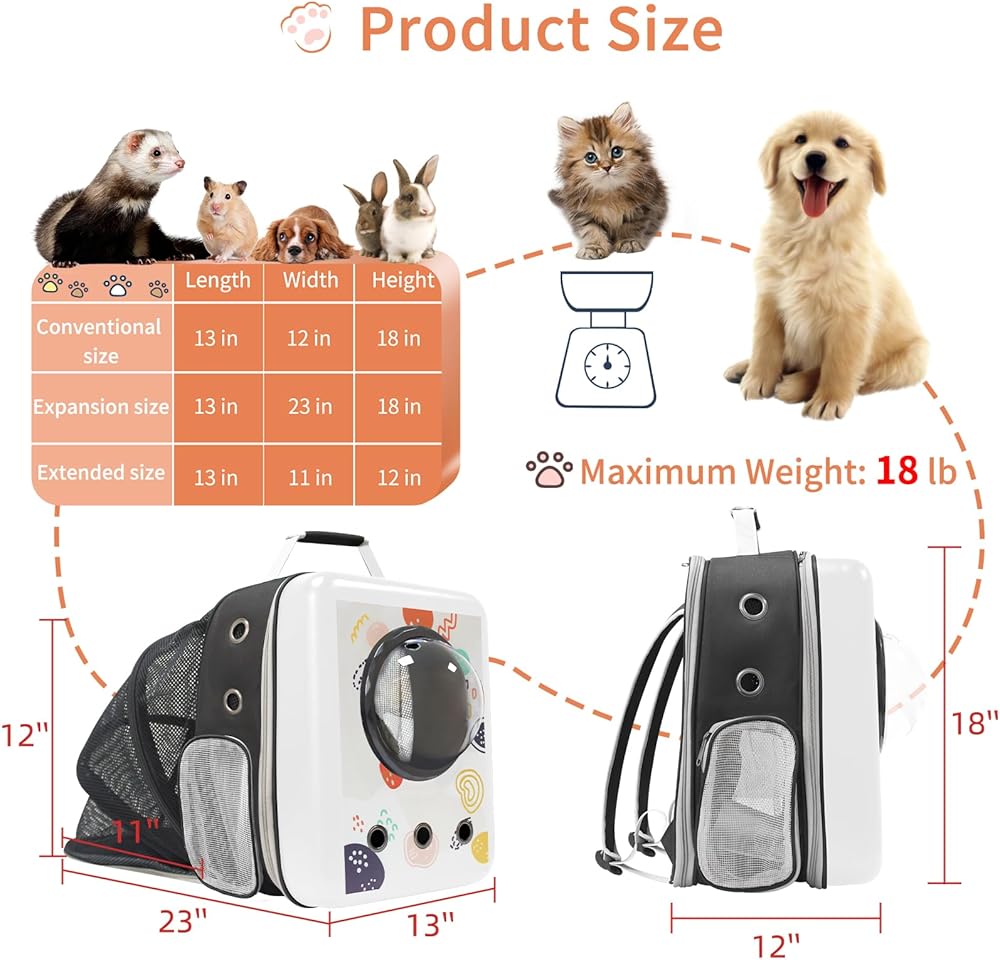 أبعاد حقيبة ظهر الحيوانات الأليفة هي 13 بوصة طول × 12 بوصة عرض × 18 بوصة ارتفاع، مع مساحة كبيرة، مناسبة للقطط الأليفة أو الجراء التي يصل وزنها إلى 18 رطل. حقيبة ظهر مربعة مبتكرة + طباعة أنيقة تجعلك أنت وصديقك المفضل مركز الاهتمام .