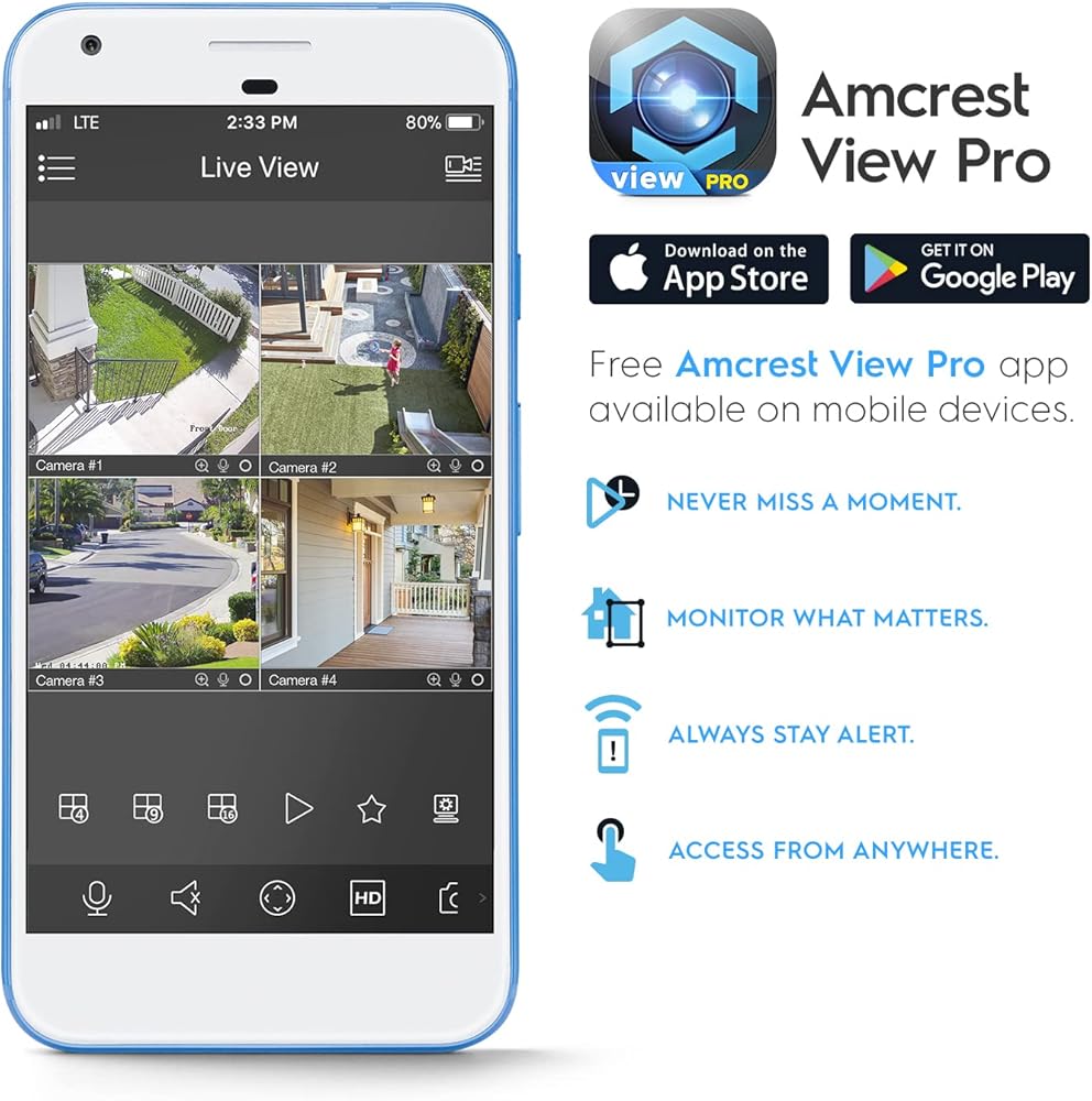 أمان أكثر ذكاءً - احصل على إشعارات تنبيه الحركة ومراجعة اللقطات عبر هاتفك الذكي باستخدام تطبيق Amcrest View. قم بالتشغيل والتسجيل بشكل احترافي على جهاز الكمبيوتر باستخدام برنامج Amcrest Surveillance Pro لنظامي التشغيل Windows وMAC (مضمن) أو Blue Iris Professional. يعمل مع تخزين الفيديو عن بعد Amcrest Cloud وAmcrest NVRs وSynology وQNAP NAS وFTP وSeaMonkey ومتصفحات Pale Moon وIE وSafari وFirefox 49.0 وChrome مع ملحق Amcrest Web View.