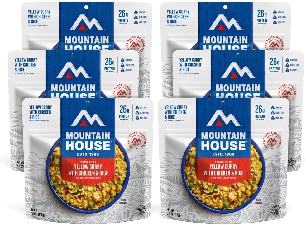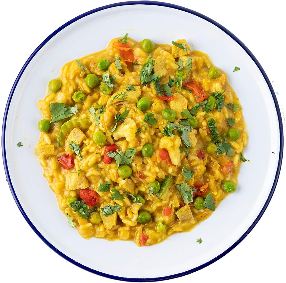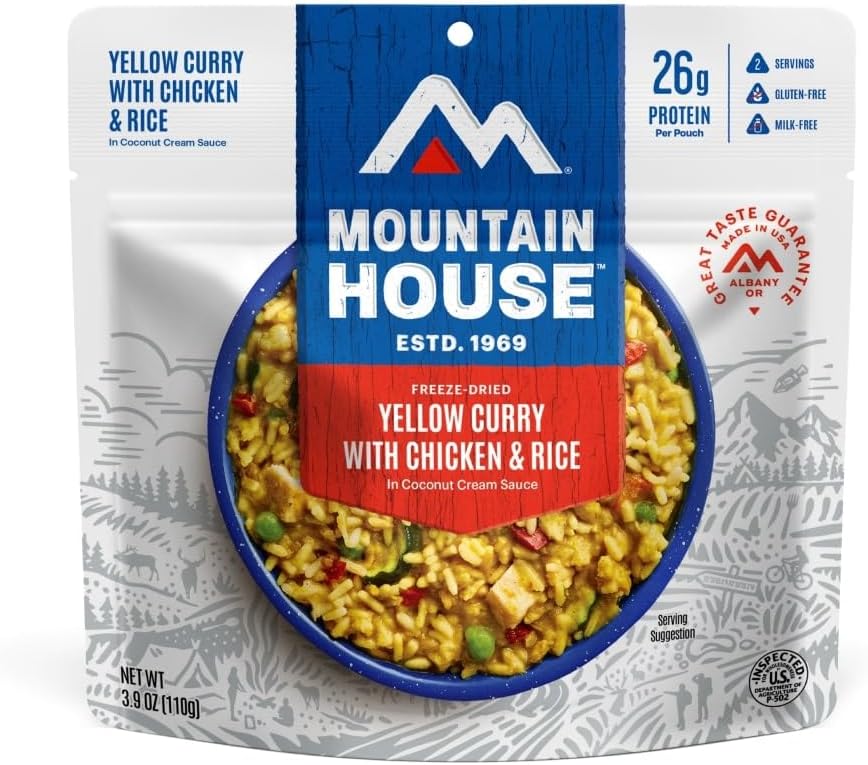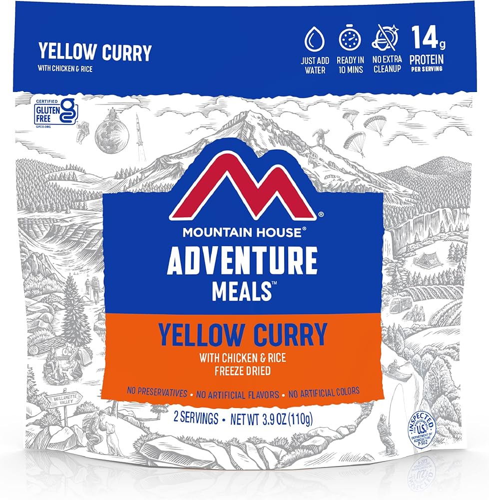 وجبة لذيذة على الطريقة التايلاندية! الكاري الأصفر مع الدجاج والكوسا والبازلاء والفلفل الأحمر لإرضاء مغامرتك القادمة. يُجفف بالتجميد للحفاظ على العناصر الغذائية والنضارة. لا حاجة للتبريد.