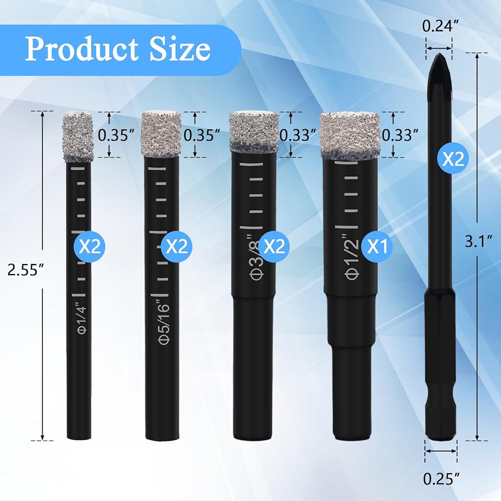 😃[مجموعة رؤوس المثقاب الماسية الكاملة] تتضمن مجموعة رؤوس المثقاب الماسية هذه المكونة من 9 قطع 1/4 بوصة × 2، و5/16 بوصة × 2، و3/8 بوصة × 2، و1/2 بوصة × 1، و1/4 بوصة × 2 سيقان سداسية للتركيب. لجميع احتياجات الحفر الخاصة بك بما في ذلك الزجاج والبلاط والسيراميك والحجر والبناء.