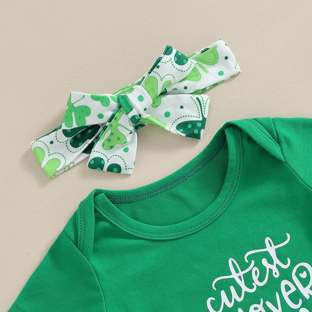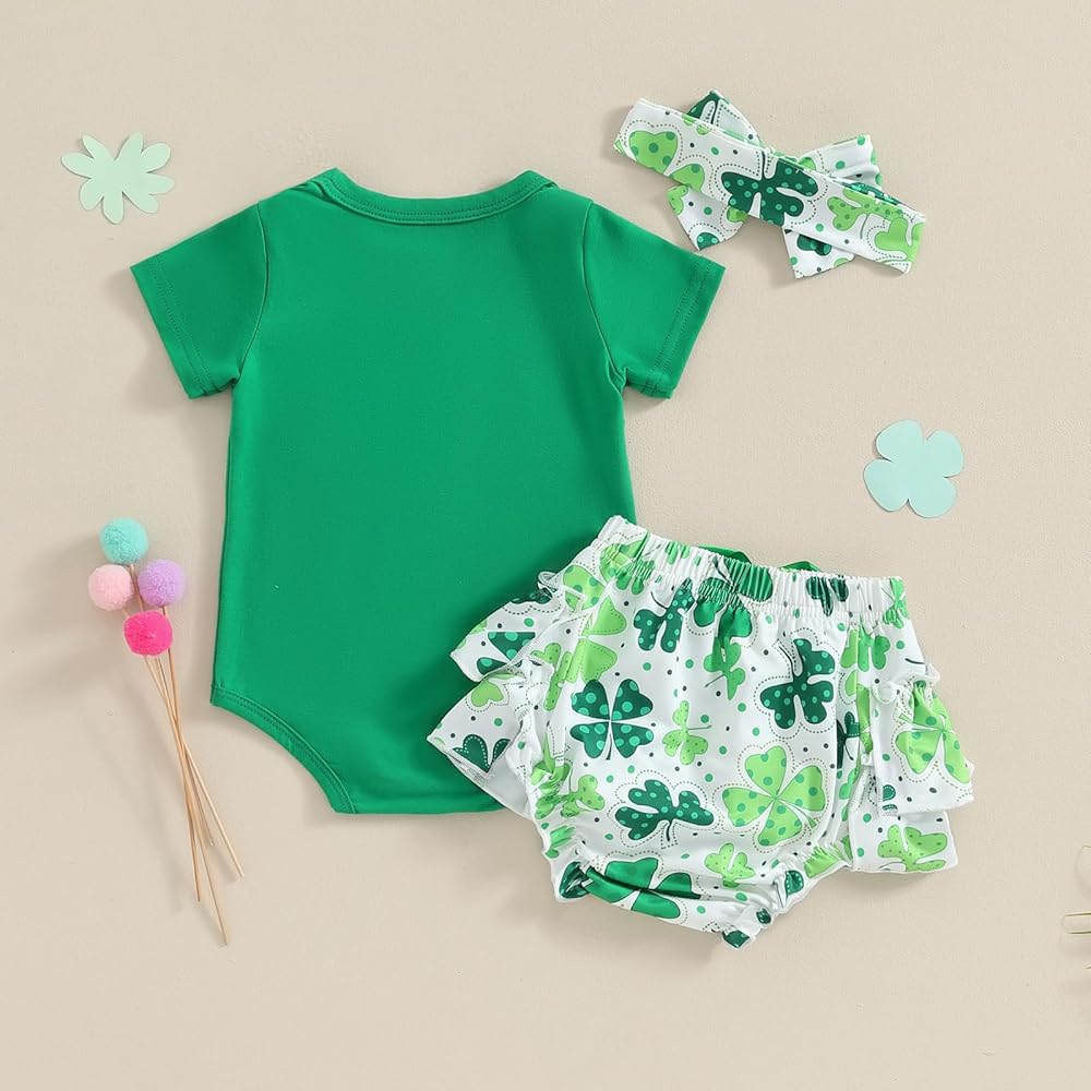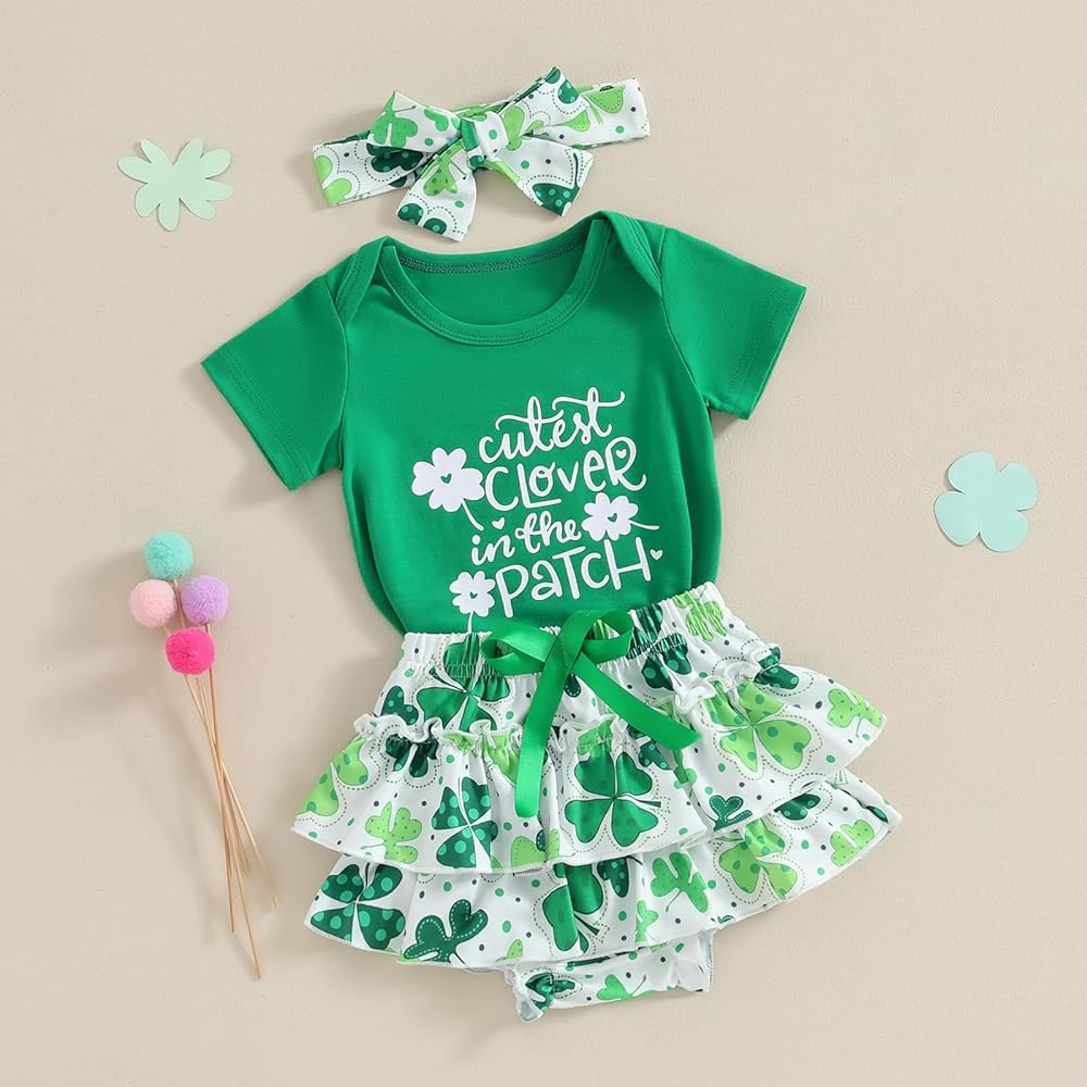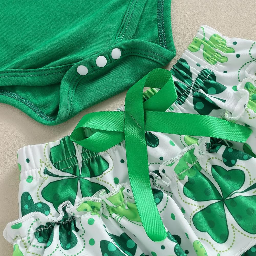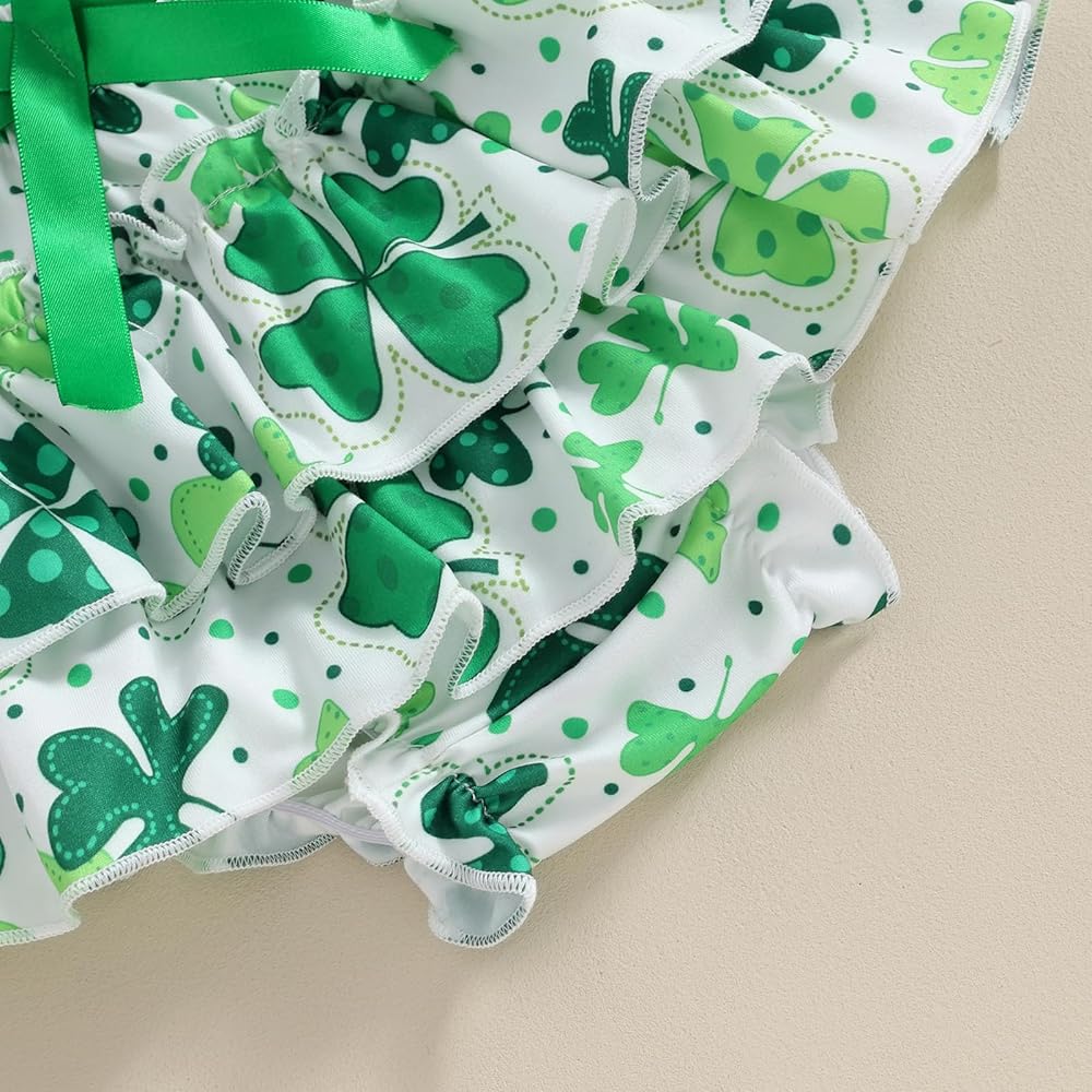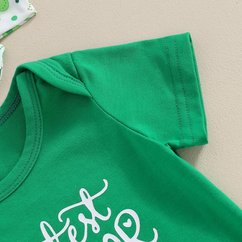 【التصميم】: زي للفتيات الصغيرات في عيد القديس باتريك، أول زي للفتيات الصغيرات في عيد القديس باتريك، مجموعة عصابة رأس من رومبر أخضر للفتيات الصغيرات، بدلة قطعة واحدة بأكمام قصيرة مطبوع عليها أربعة حروف البرسيم، خصر عالي المرونة مكشكش بأربعة طبقات من البنطلونات المطبوعة على شكل البرسيم السراويل القصيرة، تجعل طفلك أكثر جاذبية ورائعة!