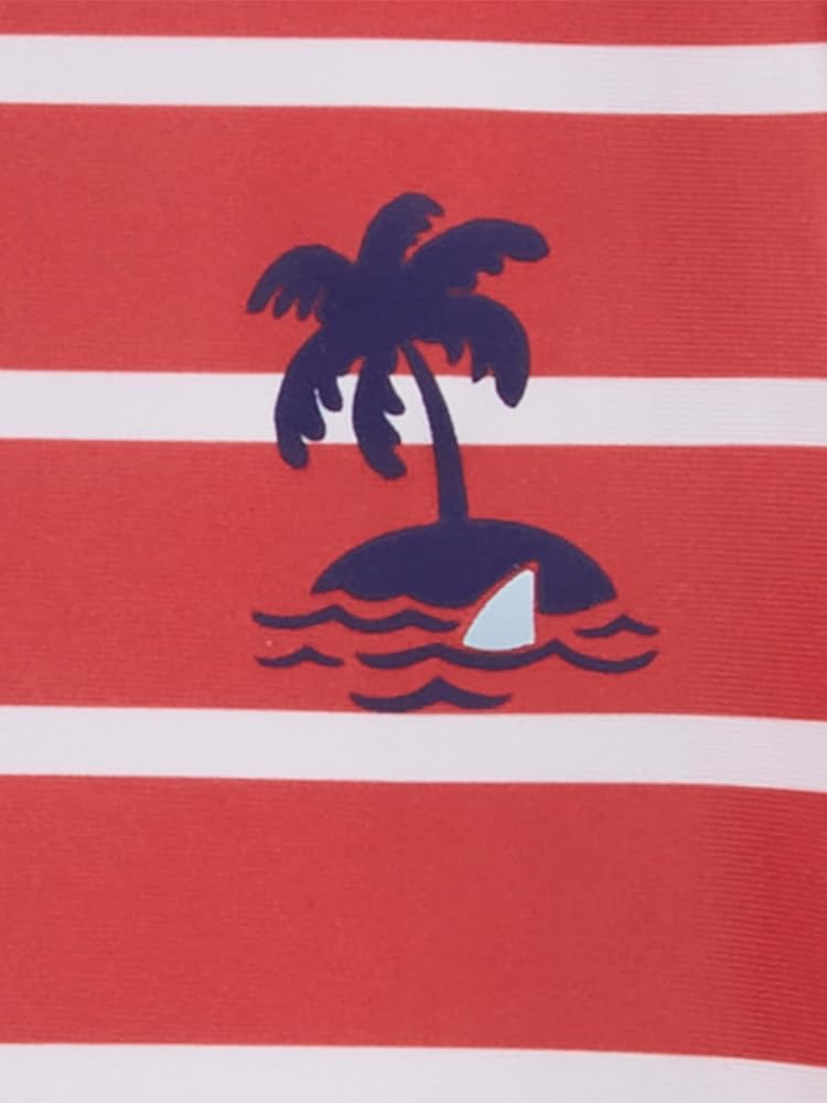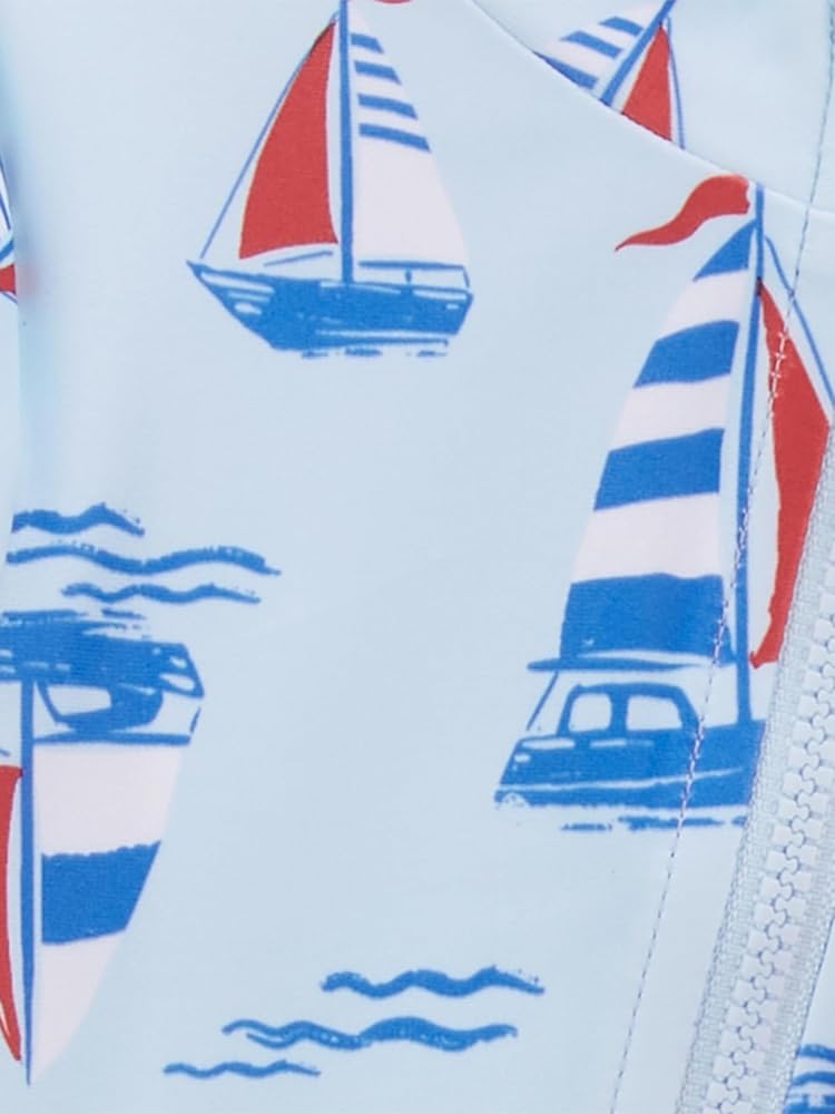 مجموعة Rashguard المكونة من عبوتين تتضمن طباعة قارب شراعي ذات مناظر طبيعية زرقاء وطباعة شريطية أفقية باللونين الأحمر والأبيض مع طباعة مناظر خلابة على الصدر الأيسر.