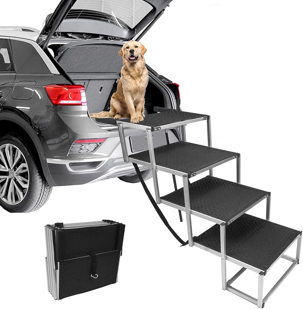 منحدر سيارة للكلاب بعرض 20 بوصة و4 خطوات وسلالم للحيوانات الأليفة وخطوات سيارة للكلاب قابلة للطي للأسرة العالية وسيارات الدفع الرباعي والشاحنات مع سطح غير قابل للانزلاق يدعم ما يصل إلى 250 رطلاً