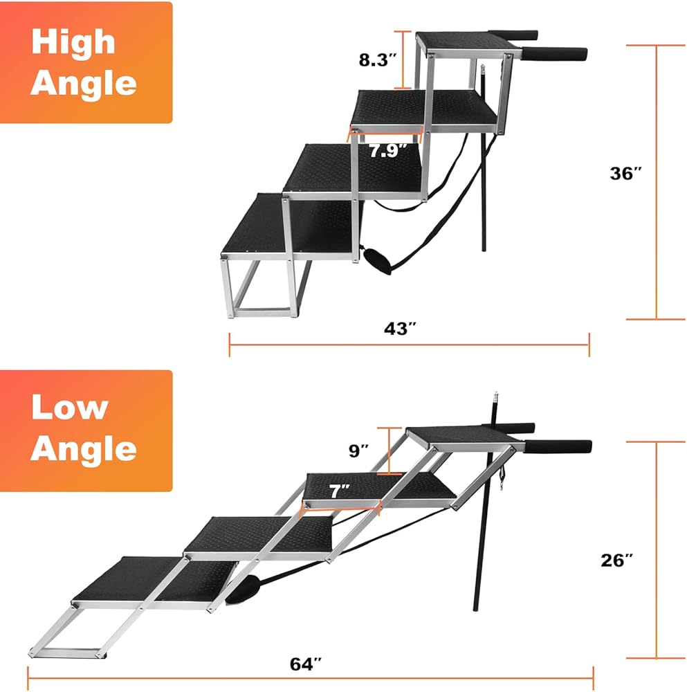 • آمن: يتميز السلم بعمق ممتد ومنحدر لطيف، مما يقلل الضغط على مفاصل كلبك ويمنع الألم والإصابة. إنها مناسبة للكلاب ذات الأرجل القصيرة أو المسنة أو المعاقين أو المصابة لتتمكن من الصعود والهبوط بأمان وثقة.