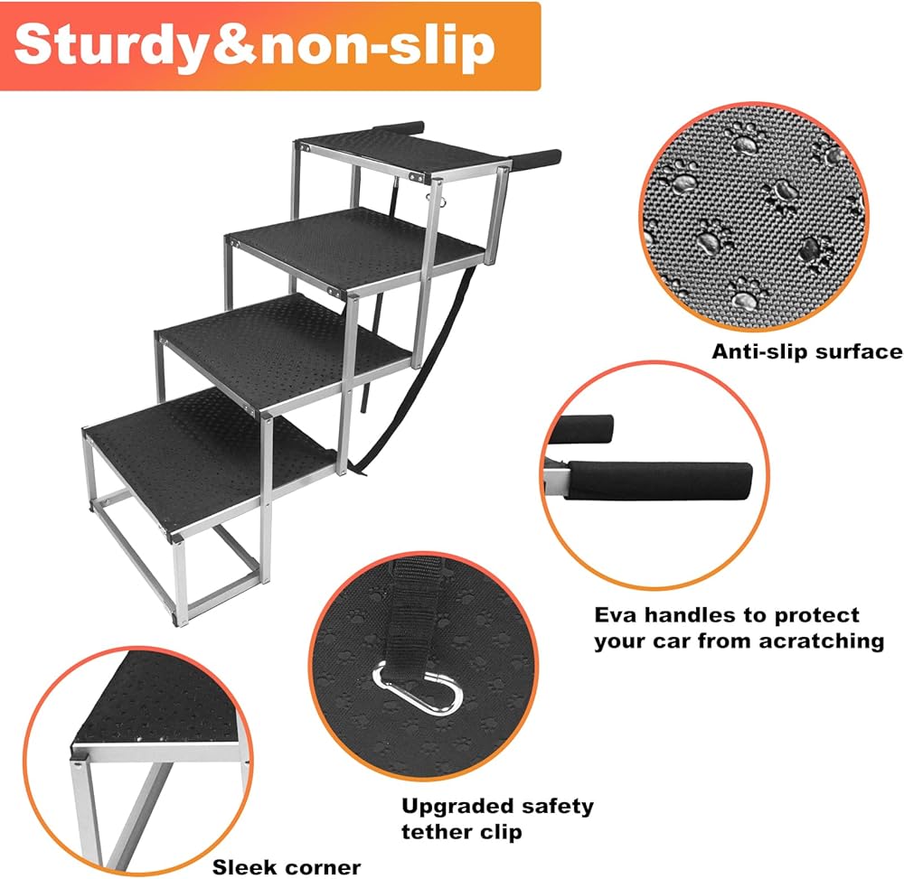 • سهل الاستخدام ومتعدد الوظائف: سلم الكلاب ذو الأربع خطوات مثالي للكلاب للدخول والخروج من السيارات أو سيارات الدفع الرباعي أو الشاحنات أو الأسرّة أو الأرائك أو طاولات الحلاقة أو الطب البيطري. ما عليك سوى وضع المقبض على الجزء الخلفي من السيارة أو حجرة الأمتعة، ثم قم بتوصيل حلقة التثبيت المصنوعة من الفولاذ المقاوم للصدأ ومزلاج الباب الخلفي.