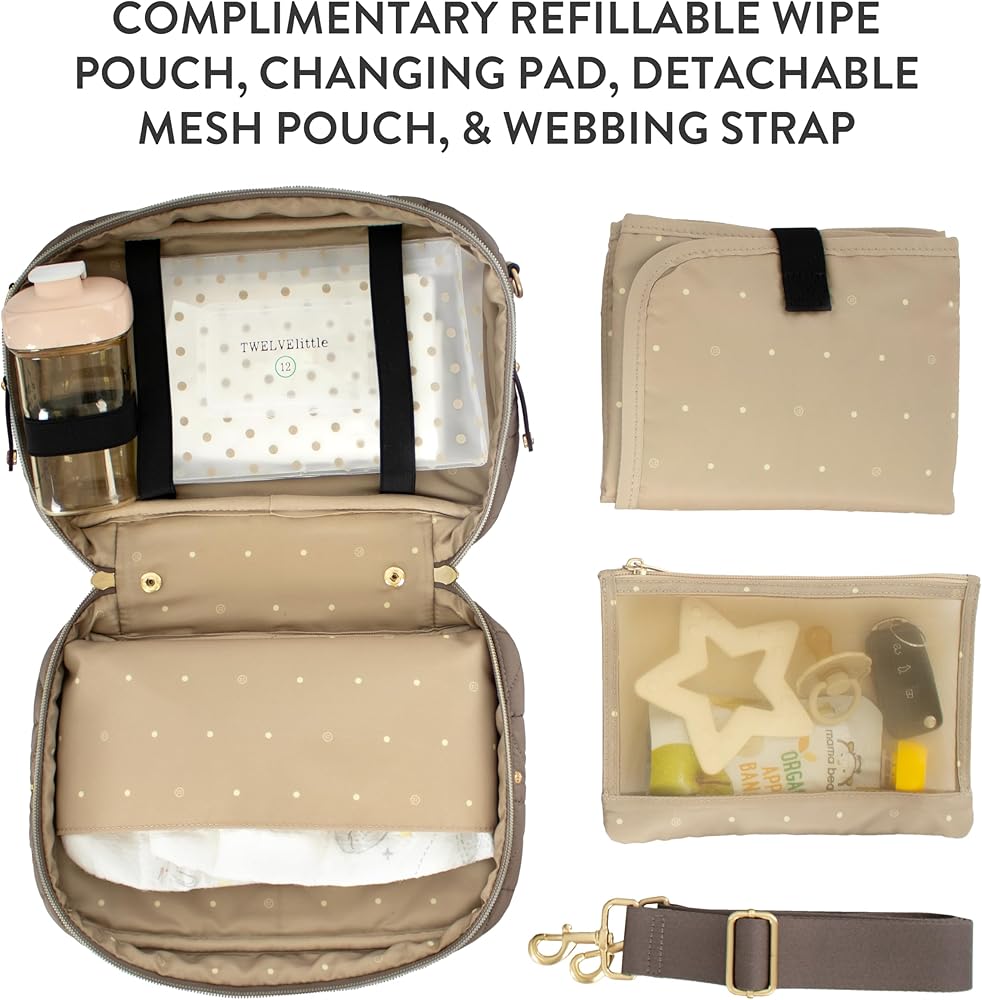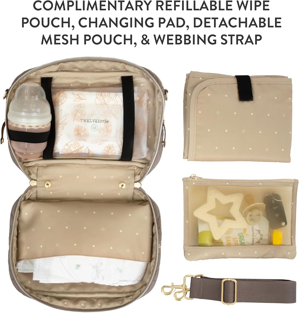 عملية: تحتوي حقيبتنا على مكان لمستلزمات حقيبة حفاضات الأطفال لتنظيم الحفاضات والمناديل المبللة ووسادة تغيير الحفاضات. يتضمن هذا أيضًا حقيبة شبكية قابلة للفصل للكريمات والمراهم. أشرطة مرنة تحمل زجاجة أو كوب سيبي وحقيبة مناديل. تشتمل حقيبتنا على وسادة تغيير الحفاضات التي يمكن غسلها في الغسالة، وهي سريعة وسهلة التنظيف
