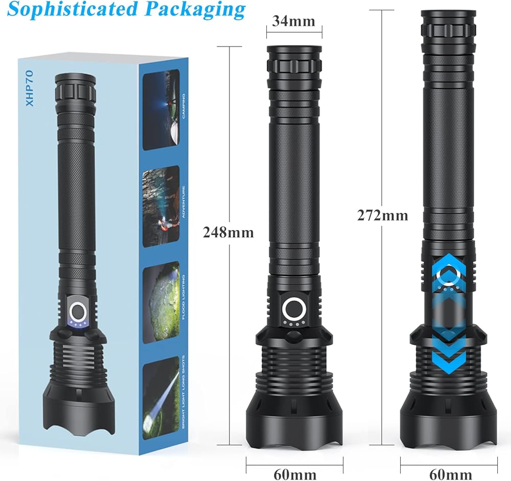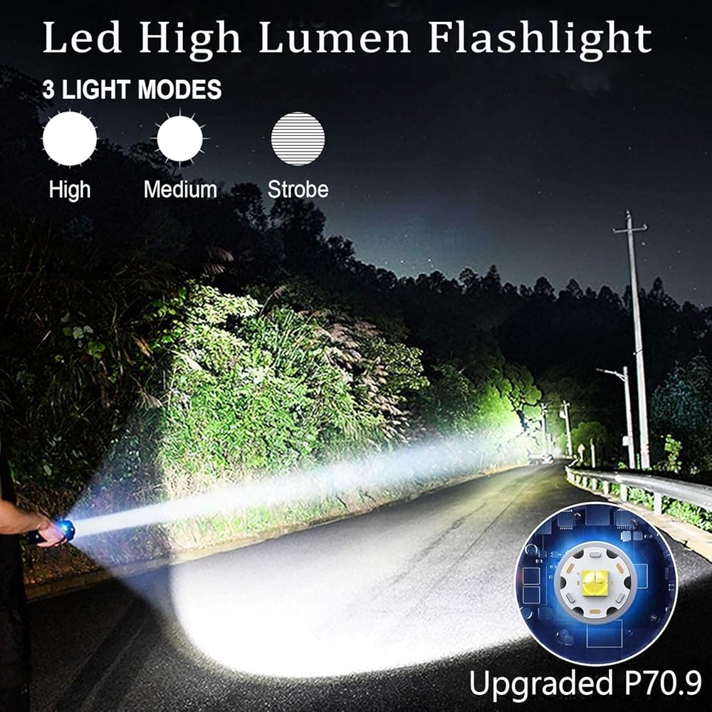 【مصباح يدوي فائق السطوع وقابل لإعادة الشحن】مصباح يدوي تكتيكي مدمج في شريحة P70.9 LED المتقدمة. يمكن لمصباح يدوي فائق السطوع أن يولد مخرجات عالية جدًا تصل إلى 990000 لومن. مصباح Alifa القابل لإعادة الشحن أكثر سطوعًا بـ 30 مرة من المصابيح المتوهجة العادية، ويضيء غرفة بأكملها بسهولة أو يركز على أشياء على ارتفاع 1640 قدمًا!