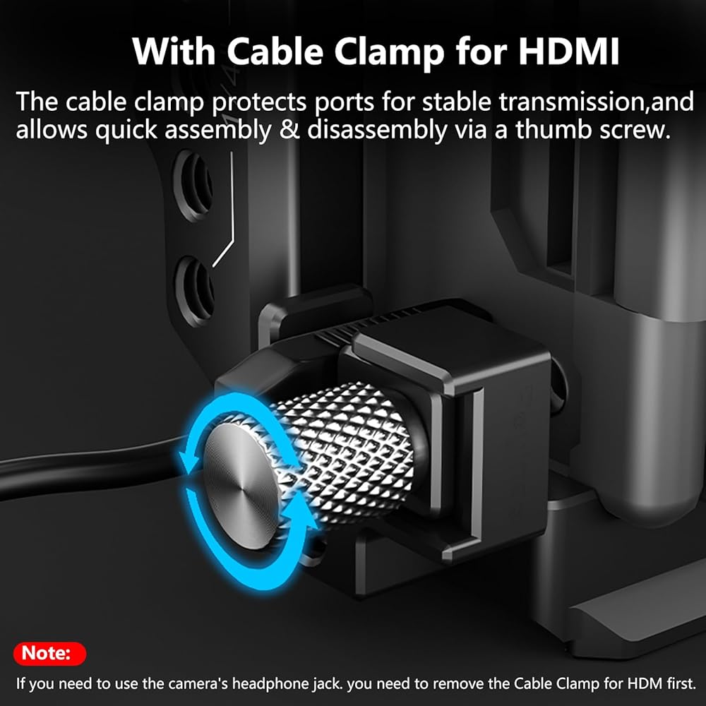 مع مشبك كابل لـ HDMI: تتضمن مجموعة القفص لجهاز Sony A6700 مشبك كابل يحمي المنافذ من أجل نقل مستقر. ملاحظة: إذا كنت بحاجة إلى استخدام مقبس سماعة الرأس بالكاميرا، فستحتاج إلى إزالة مشبك كابل HDMI أولاً.