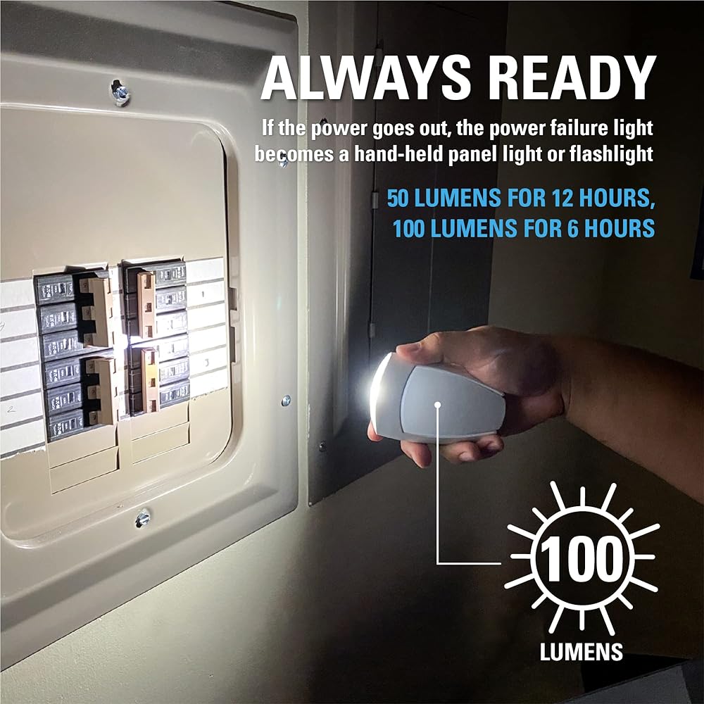 جاهز دائمًا - إذا انقطعت الطاقة، يصبح مصباح لوحة أو مصباح يدوي فائق السطوع (100 لومن من الضوء الأبيض البارد). استخدمه لمساعدتك على القراءة أو فحص قاطع الدائرة الكهربائية أو التنقل في منزلك في الظلام.