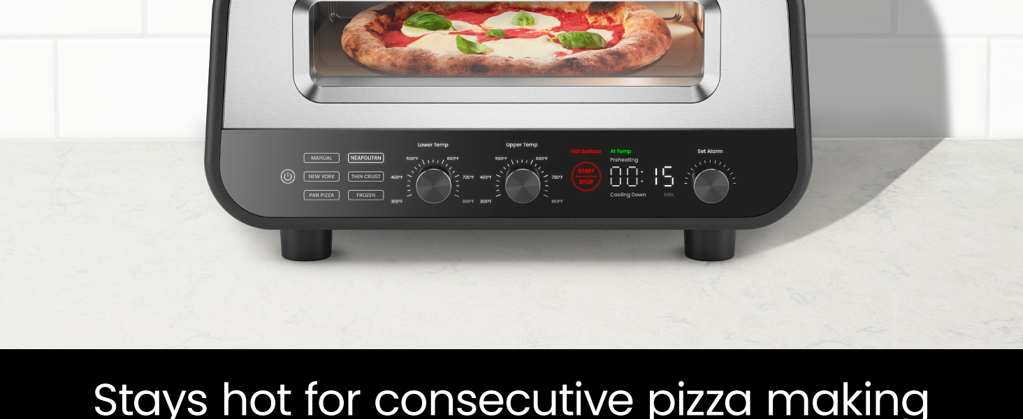 HIGH AND VARIABLE HEAT: Crank up the temperature on this countertop pizza oven. Both heating elements range from 300-800°F to make pizza your way, and retain the heat for back-to-back cooking.