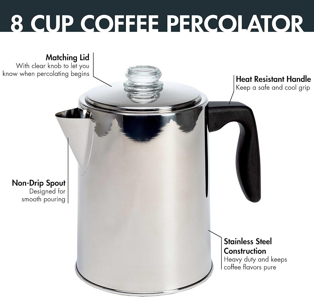 The Primula Stainless Steel Stovetop Coffee Percolator brews up to 8 cups of rich, smooth coffee from the convenience of your home. Crafted from premium stainless steel for long-lasting performance and durability. It features a removable filter basket that eliminates the need for messy disposable filters. The heat-resistant handle and non-drip spout make for safe and mess-free pouring. The coffee pot and filter are dishwasher safe for easy cleanup; we recommend hand washing the lid. Lastly, the percolator works on electric, ceramic and gas stovetops including propane, making it the perfect camping coffee pot. To use, simply fill with water to the fill line marked 8-cups, add coffee grounds to the removable filter basket, and secure the basket in the coffee pot. Place the coffee maker on the stovetop and turn the heat to medium-low. Make sure to position the handle away from the heat source. Once the water starts to boil, the coffee will begin to percolate. Monitor the brew strength by watching the coffee percolate in the clear glass knob on top of the lid. Once the coffee has reached your desired strength, remove from heat and enjoy. The Primula Stainless Steel Coffee Percolator is a great way to brew delicious, fresh coffee at home, saving you time and money. Visit the Primula Brand Store for more award-winning coffee and tea must-haves!