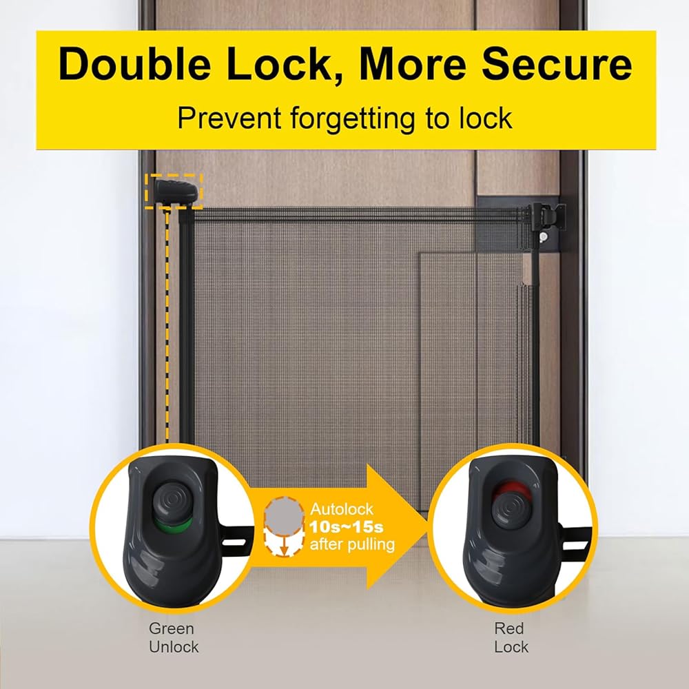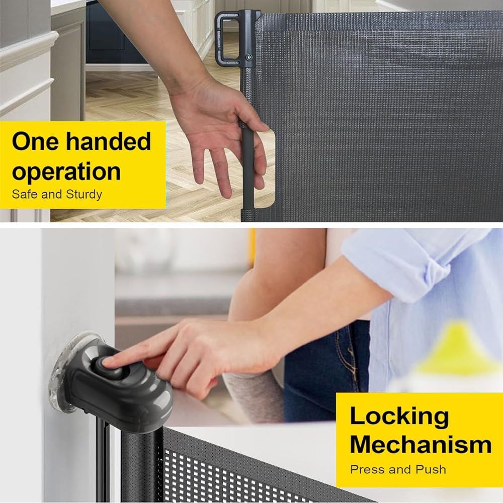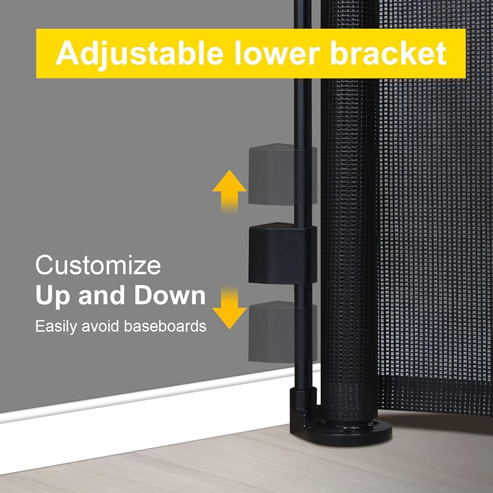 【باب شبكي صديق للأطفال】 بوابة الأطفال القابلة للسحب مصنوعة من نسيج شبكي قوي مقاوم للأشعة فوق البنفسجية وABS مع شهادة CPC. يسمح الهيكل الشبكي بتدوير الهواء، ويمنع طفلنا من أي ضرر عندما يصطدم بالباب عن طريق الخطأ.
