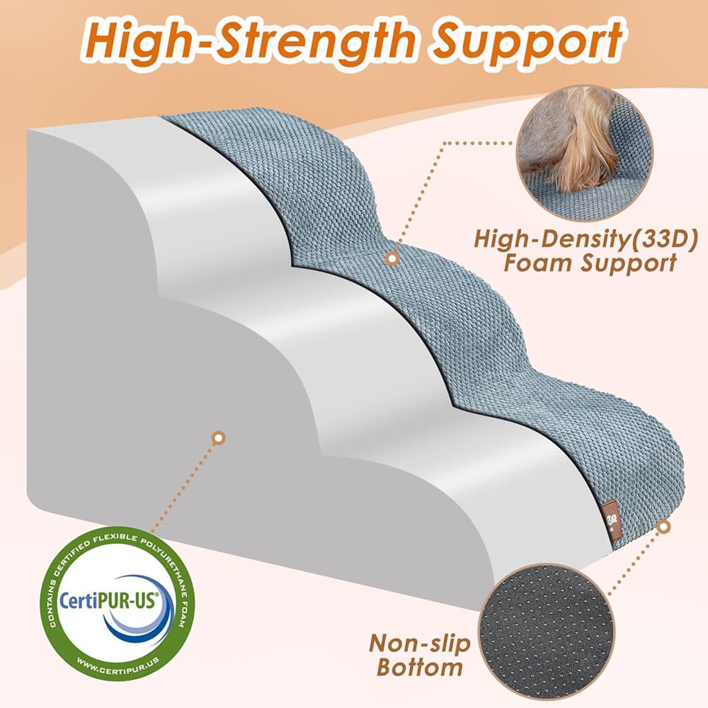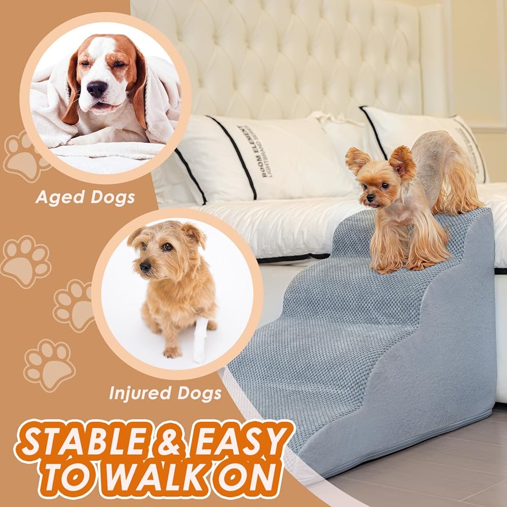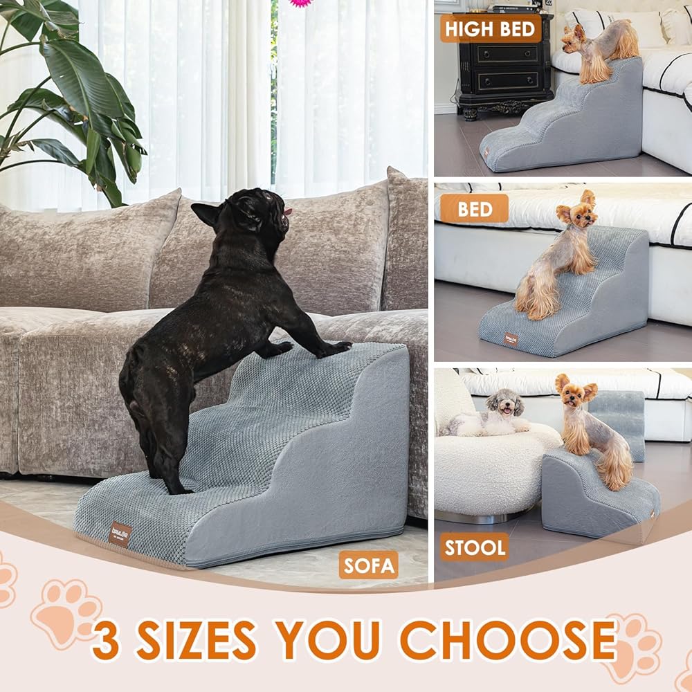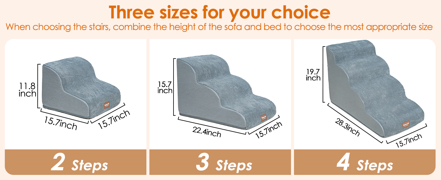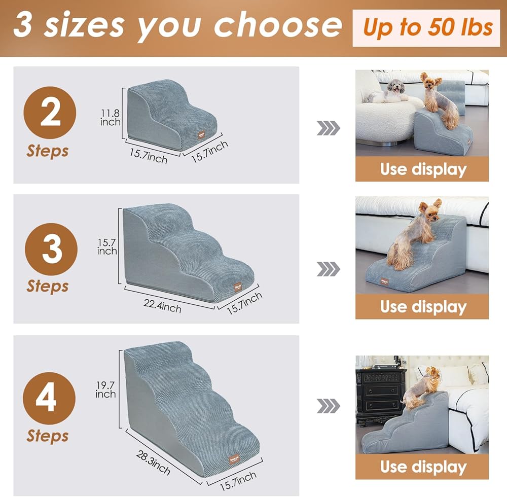 مقاسات متعددة الخطوات - يحتوي درج الكلاب هذا على خطوتين و3 خطوات و4 خطوات لتختار منها. سلالمنا المكونة من درجتين تناسب الكرسي/الأريكة/السرير حتى 13 بوصة. سلالم من 3 خطوات تناسب الكرسي/الأريكة/السرير حتى 17 بوصة. سلالم من 4 خطوات تناسب الكرسي/الأريكة/السرير حتى 21 بوصة. مثالية للجراء والسلالات قصيرة الأرجل والكلاب المصابة والكلاب ذات القدرة المحدودة على الحركة والحيوانات الأليفة الأكبر سنًا.