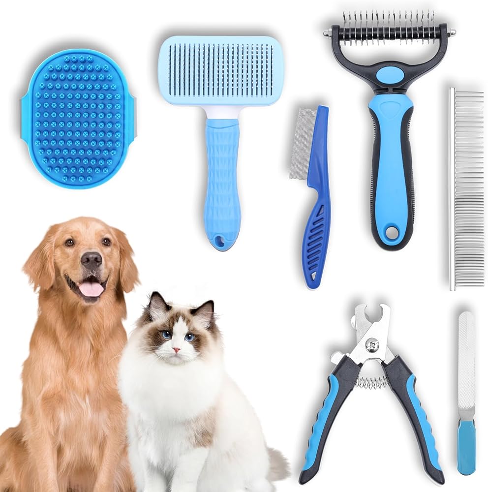 🐶【مجموعة العناية بالكلاب】تتضمن فرشاة لتصفيف الحيوانات الأليفة، وفرشاة للتنظيف الذاتي، ومشط للبراغيث للكلاب، ومشط من الفولاذ المقاوم للصدأ، وفرشاة استحمام للكلاب، وقصافة أظافر للحيوانات الأليفة، ومبرد أظافر للحيوانات الأليفة. الوفاء بالرعاية اليومية لتصفيف شعر الحيوانات الأليفة