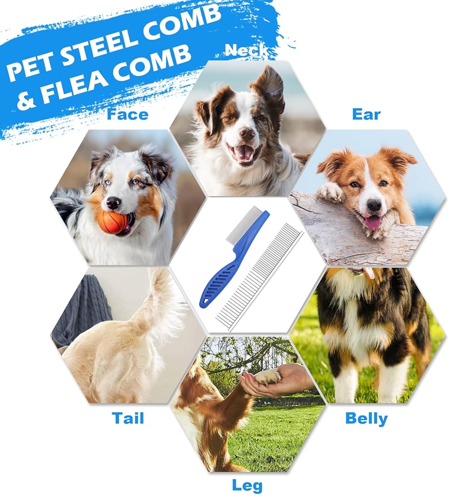 🐶【قطعتان من أمشاط العناية بالكلاب】مشط للكلاب من الفولاذ المقاوم للصدأ ومشط لبراغيث الكلاب بمقبض بلاستيكي. (1) مشط ذو أسنان خشنة وناعمة لتصفيف الحيوانات الأليفة، لإزالة الطبقة السفلية المتشابكة (2) مشط البراغيث لإزالة البراغيث. 3 مستويات مختلفة من الكثافة لتخفيف أي فراء زائد