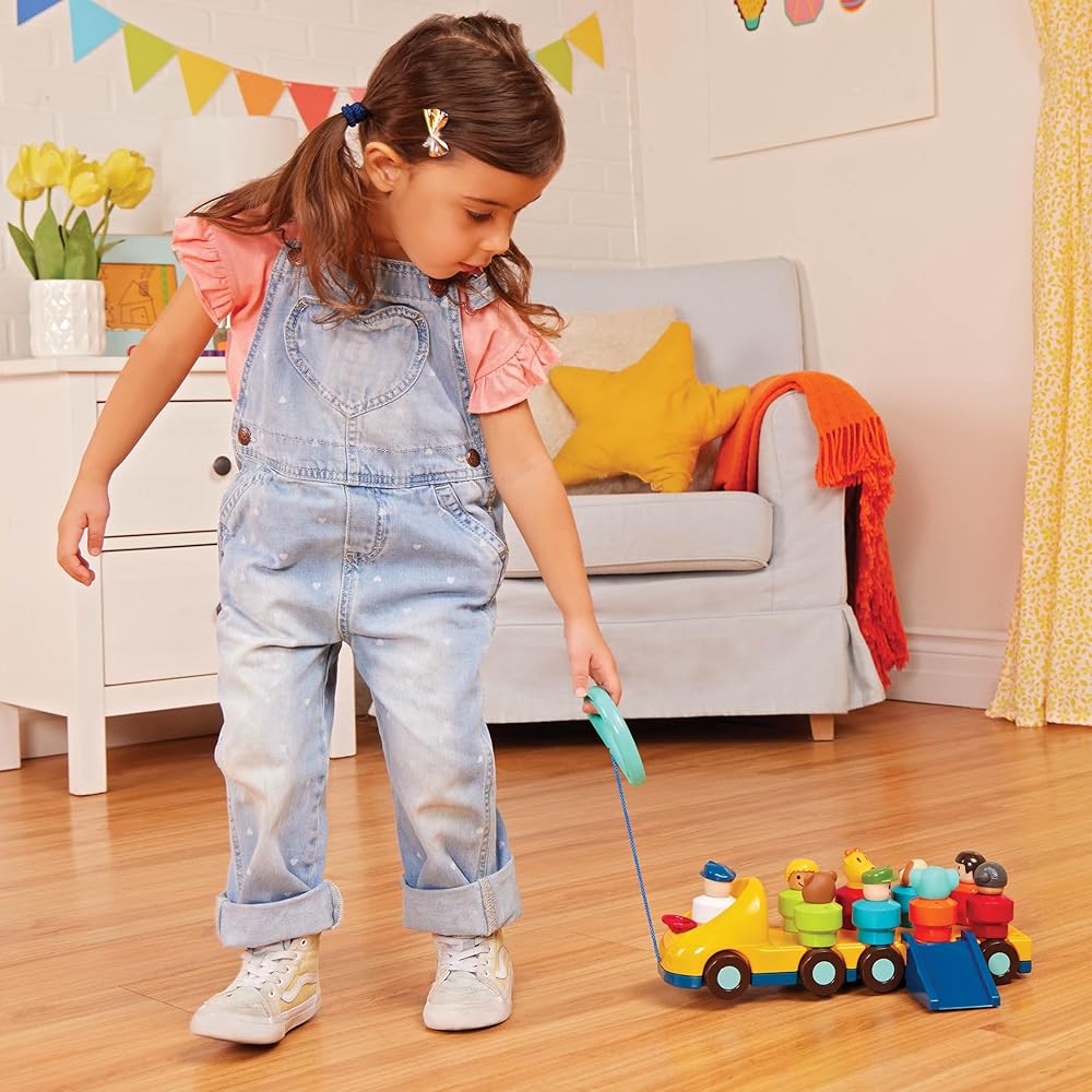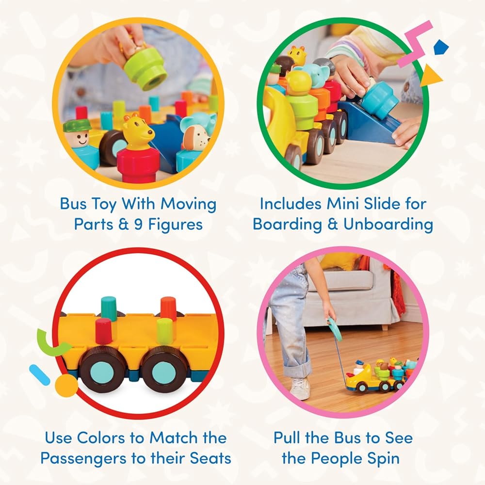 FUN PULL TOYS: Enjoy an upgrade on an old classic with this toy bus by Battat. With a generic bus design, your toddler can pretend that this bus is from the city or a school while imagining adventures and stories about the 9 passengers.