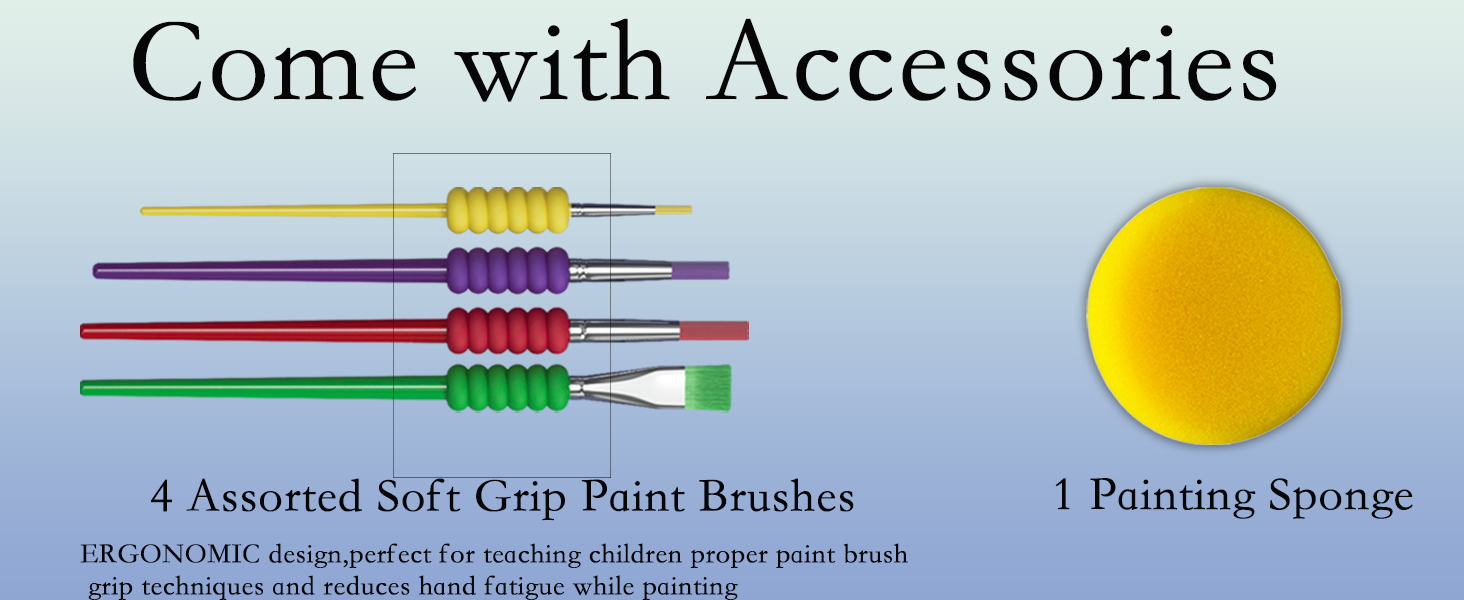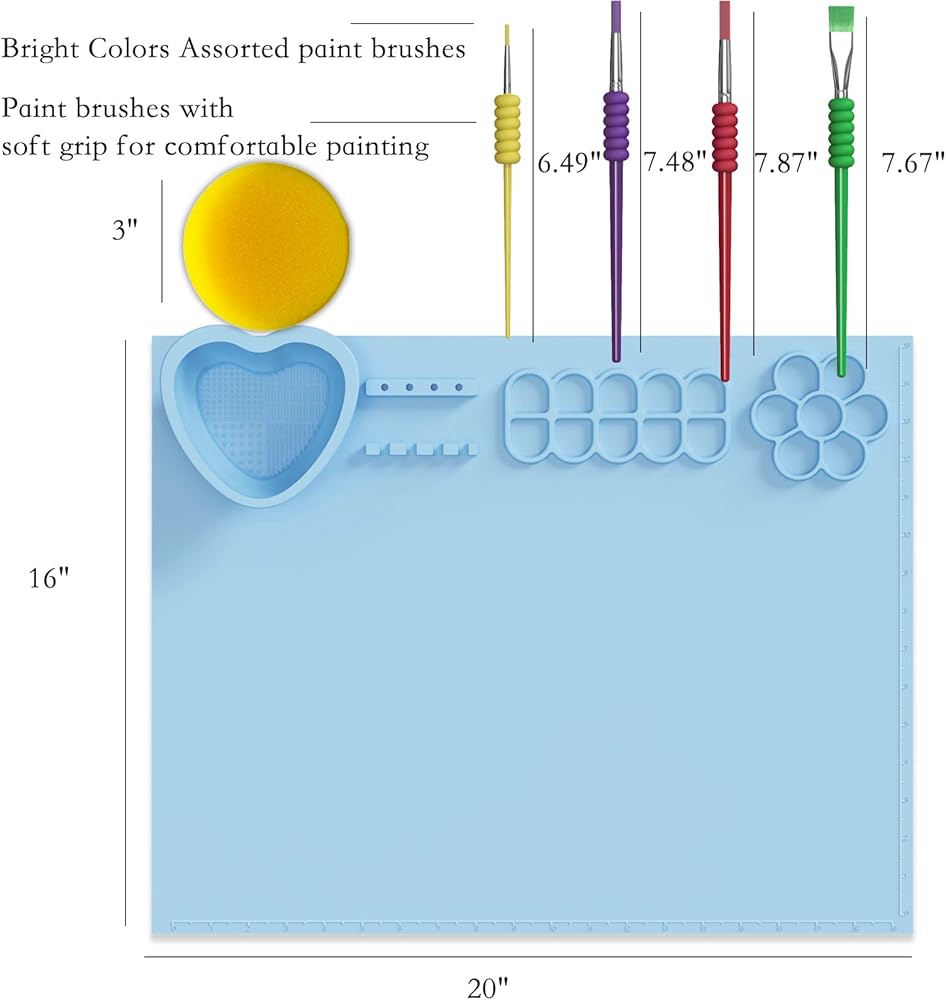 【تأتي مع ملحقات الطلاء】: تأتي حصيرة الطلاء المصنوعة من السيليكون مع مجموعة حامل الأكواب والفرشاة مع 4 فرش طلاء متنوعة ذات قبضة ناعمة وإسفنجة طلاء واحدة. التصميم المريح على فرش الطلاء، مثالي لتعليم الأطفال تقنيات قبضة فرشاة الطلاء المناسبة ويقلل من تعب اليد أثناء الرسم.