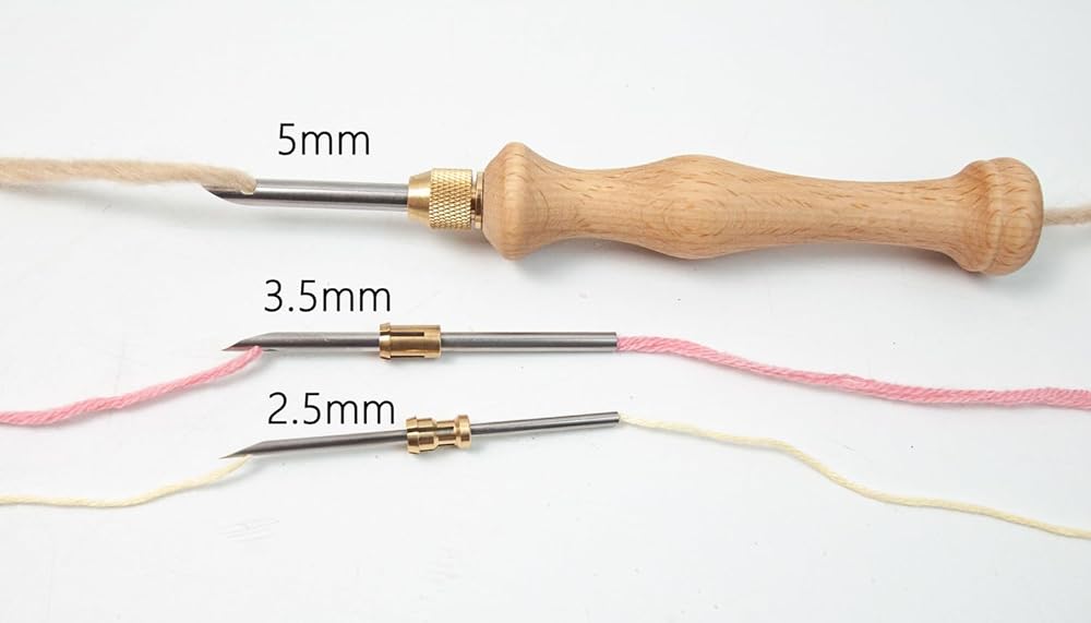 This Nurge Punch Needle set includes 3pcs stainless steel and 3 different sizes of metal tubes (2 mm (0.079 Inch) - 3.5 mm (0.138 Inch), 5 mm (0.196 Inch), 1pcs wooden handle made of German beechwood, 1pcs needle threader, 1pcs instruction.