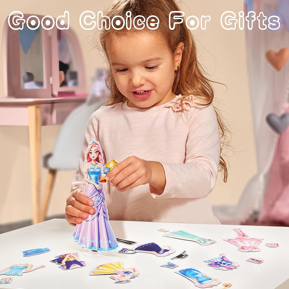 👧👗 دمية الملابس المغناطيسية الخاصة بنا مصنوعة من مادة ورقية وهي مغناطيسية، مما يضمن اللعب والاستخدام طويل الأمد والمتانة. تتميز هذه الدمى الورقية بأزياء أميرات متطابقة، ومع الملابس والإكسسوارات المغناطيسية، يمكن دمجها ومطابقتها مع أنماط ملابس مختلفة لخلق مظهر فريد من نوعه.