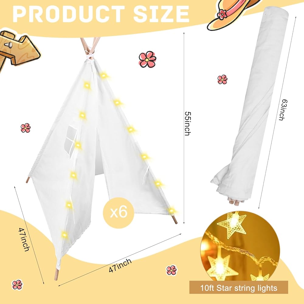 خيم ذات مساحة كبيرة: يبلغ عرض خيمة تيبي البيضاء للأطفال 47 بوصة وارتفاعها 55 بوصة، والتي يمكن أن تستوعب طفلًا أو طفلين للعب. يمكن للأطفال القراءة أو ممارسة الألعاب في الداخل.