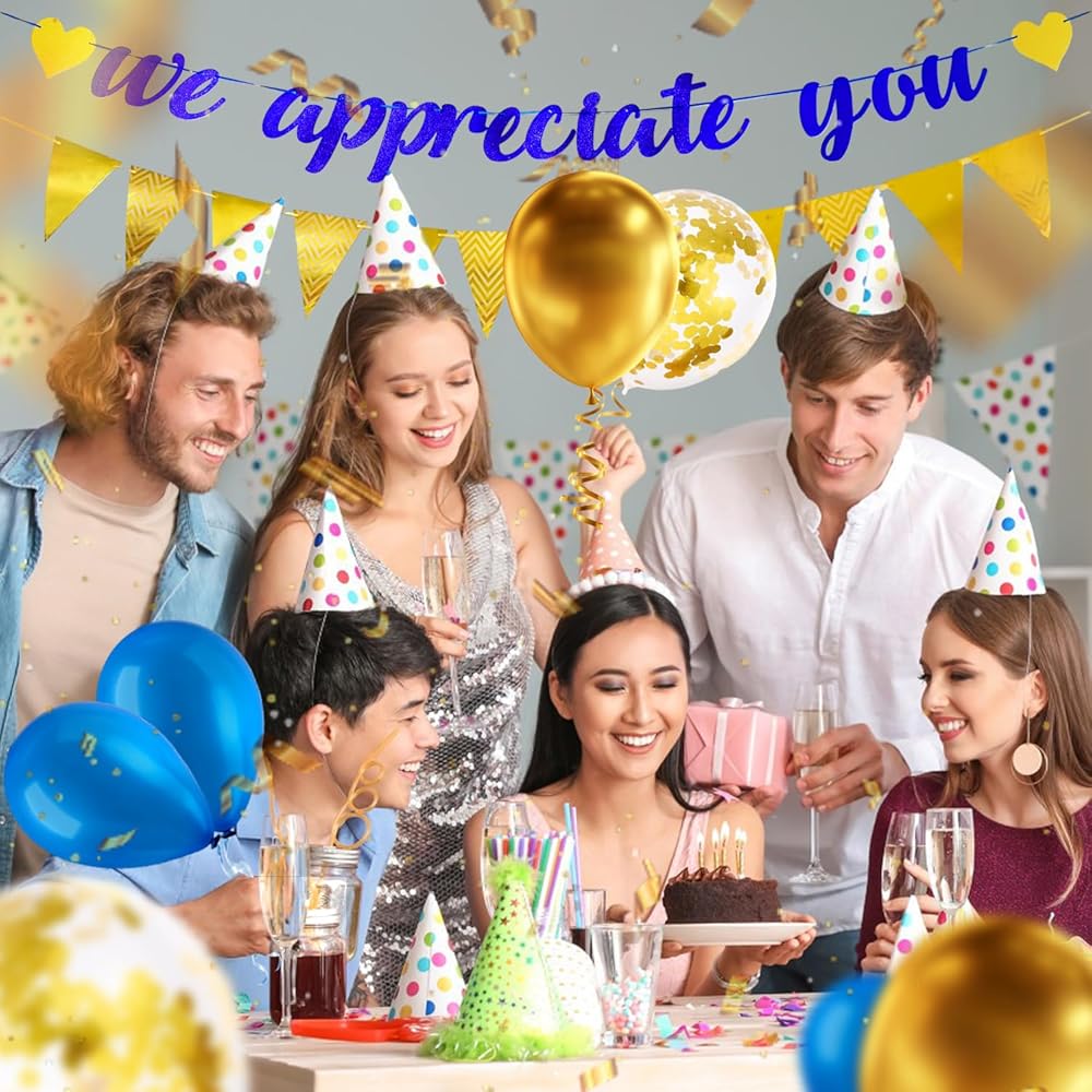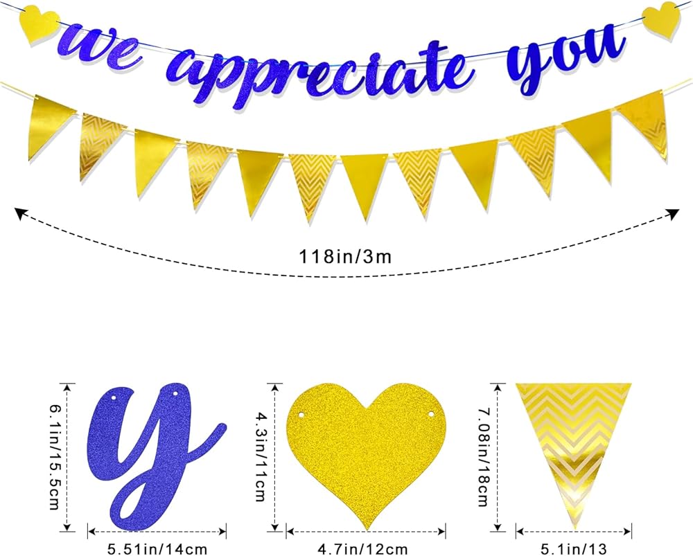 • 🎈ما ستحصل عليه: يتضمن تقدير موظفينا لافتة واحدة مكتوب عليها "نحن نقدر لك"، ومجموعة من الأعلام المثلثة الذهبية، و6 بالونات زرقاء، و4 بالونات ذهبية، و2 بالونات بلاتينية.