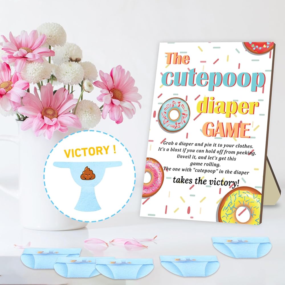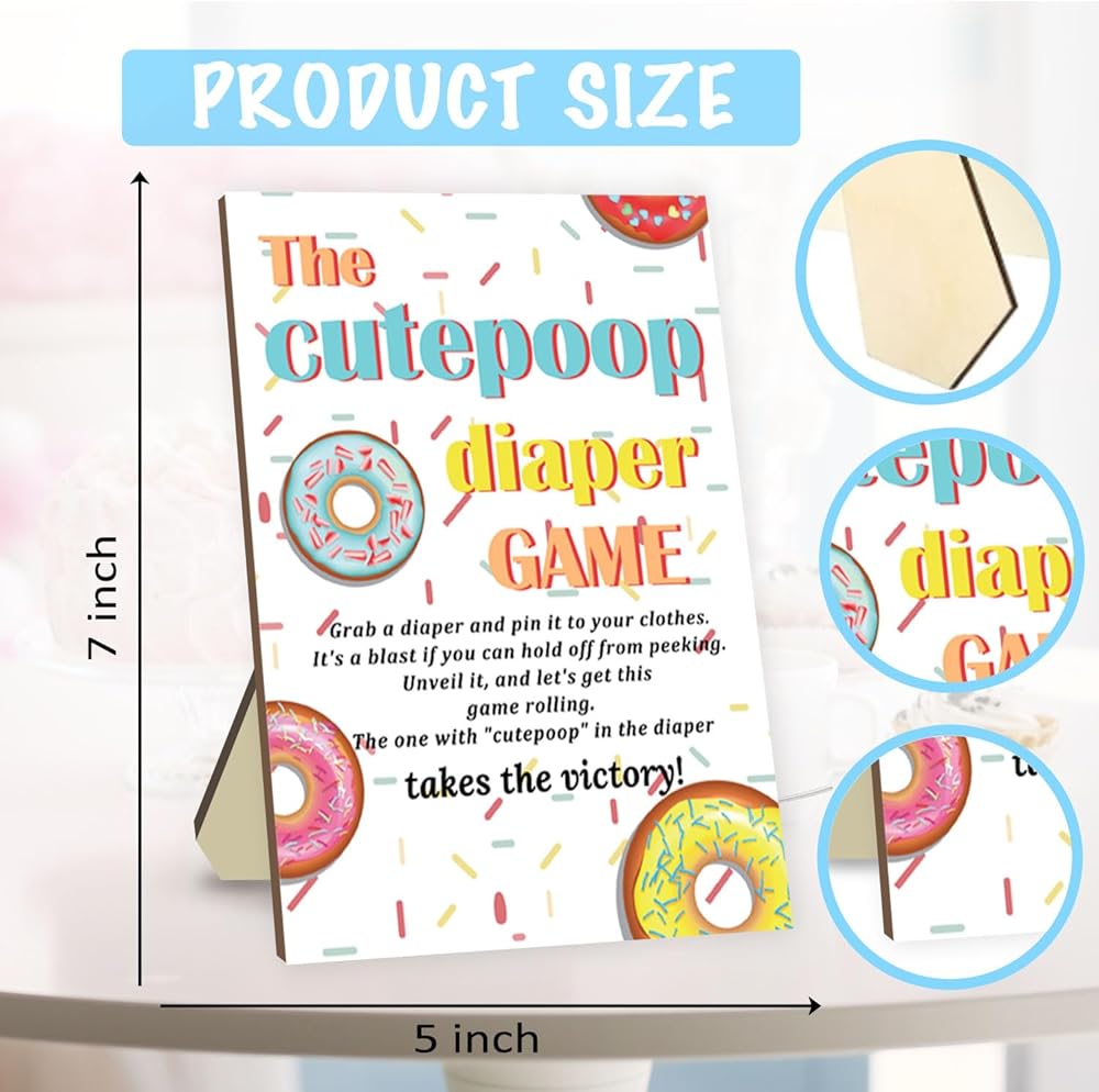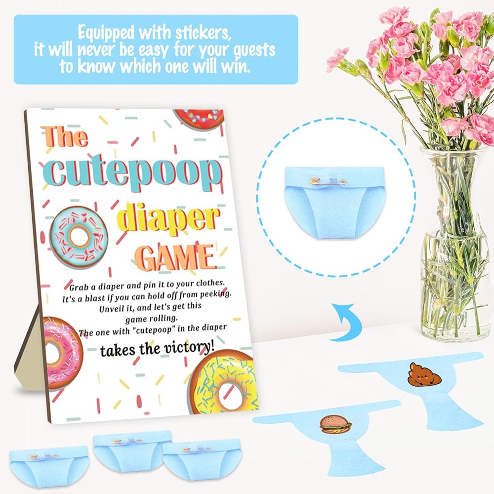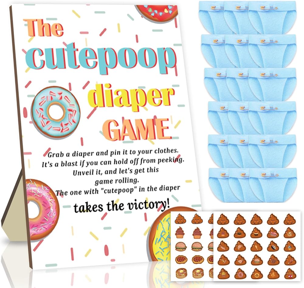 كيفية الاستخدام: قم بتوزيع الحفاضات على كل ضيف وربطها. عندما يحين الوقت، اطلب من كل ضيف أن يفتح حفاضاته. الضيف الذي يرتدي الحفاضة البنية "القذرة" هو الفائز!