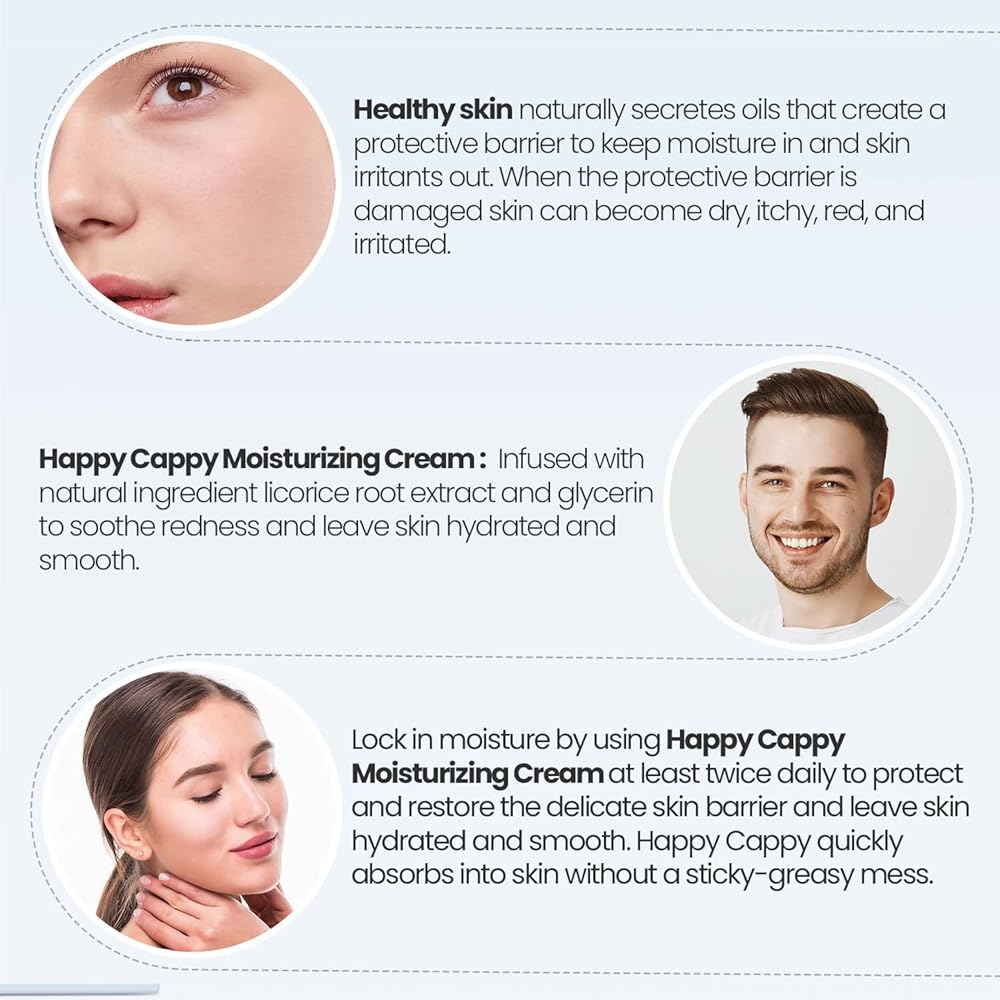 تم اختبار كريم الترطيب Happy Cappy سريريًا، وهو مملوء بمكونات طبيعية من مستخلص جذر عرق السوس (ثنائي بوتاسيوم جليسيرريزات) للمساعدة في تهدئة الاحمرار.