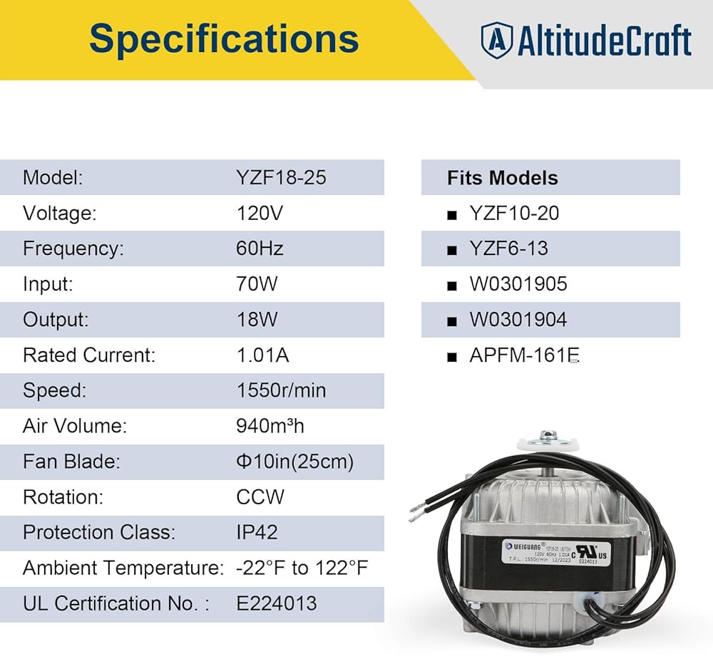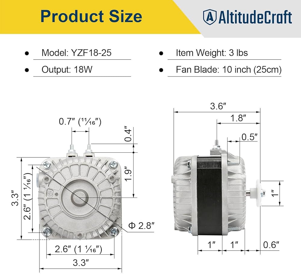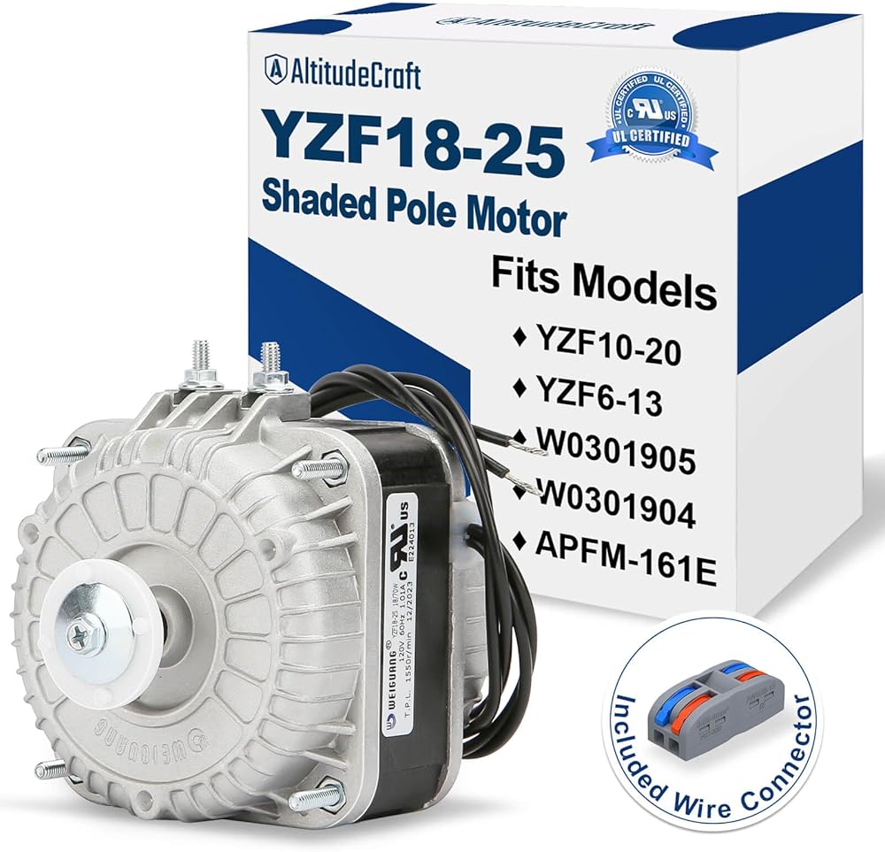تطابق تام وسهولة التركيب: يوفر محرك المروحة المكثف AltitudeCraft YZF18-25 ملاءمة مثالية لمختلف العلامات التجارية والموديلات مثل YZF10-20، وYZF6-13، وAPFM-161E. مطابقة تمامًا للأجزاء الأصلية، وهي مثالية لكل من الإصلاحات الاحترافية والمشروعات اليدوية. إن تصميمه سهل التركيب يجعله الخيار الأفضل لصيانة الثلاجات وأجهزة التبريد التجارية، ولا يتطلب أي مهارات متخصصة للتركيب.
