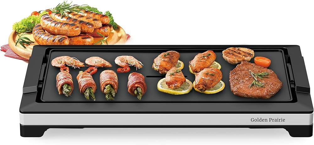 【سطح طهي كبير غير لاصق】صينية البراري الذهبية باستخدام طلاء غير لاصق عالي الجودة. حجم الشواية: 23.5 بوصة × 12.6 بوصة × 3.3 بوصة (طول × عرض × ارتفاع) مع سطح طهي غير لاصق مقاس 20.28 بوصة × 9.84 بوصة (طول × عرض)، مناسب لحفلة مكونة من 8 أشخاص تقريبًا. طهي شرائح اللحم والدجاج ولحم الخنزير بسهولة ، الأسماك، أي شيء تشويه على الشواية الخارجية الخاصة بك يمكن شواؤه في الداخل، يمكنك بسهولة إكمال وجبة دسمة ولذيذة بدون زيت أو كمية قليلة فقط من الزيت، مما يحافظ على الطعام لذيذًا مع جعل النظام الغذائي أكثر صحة.