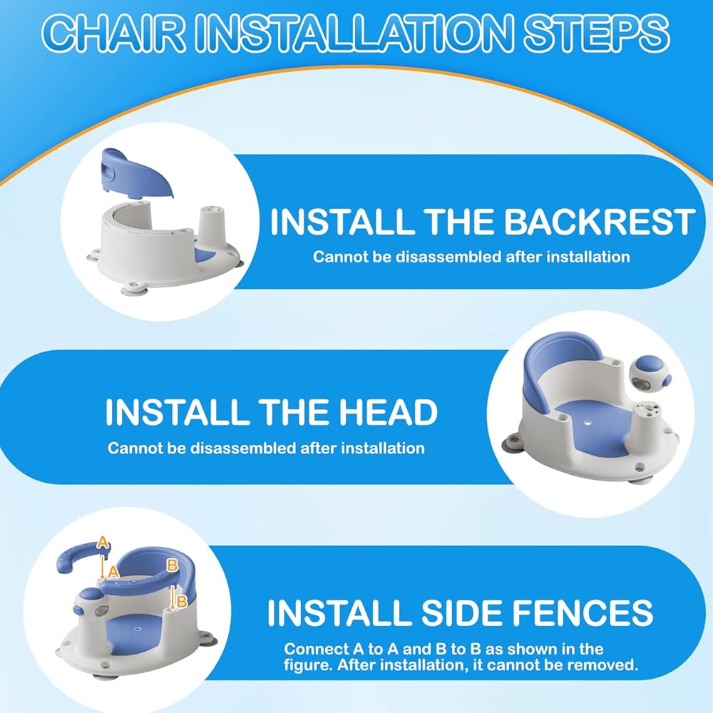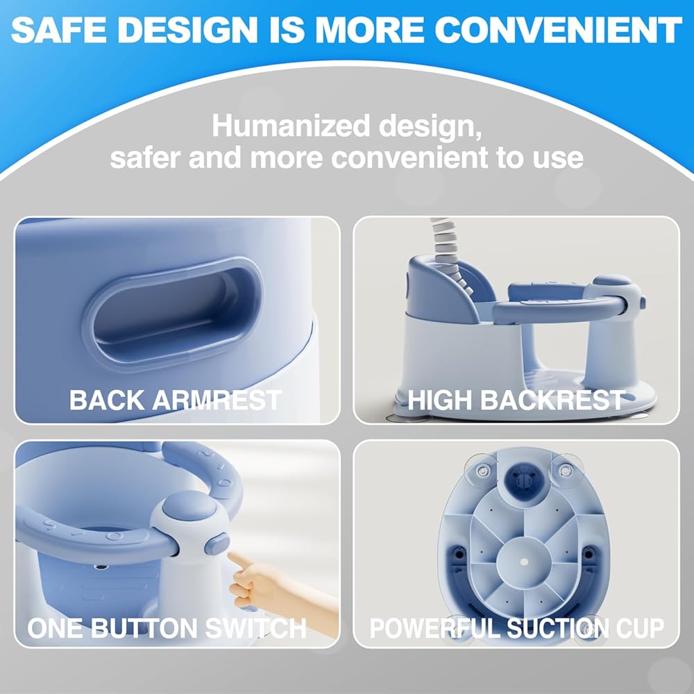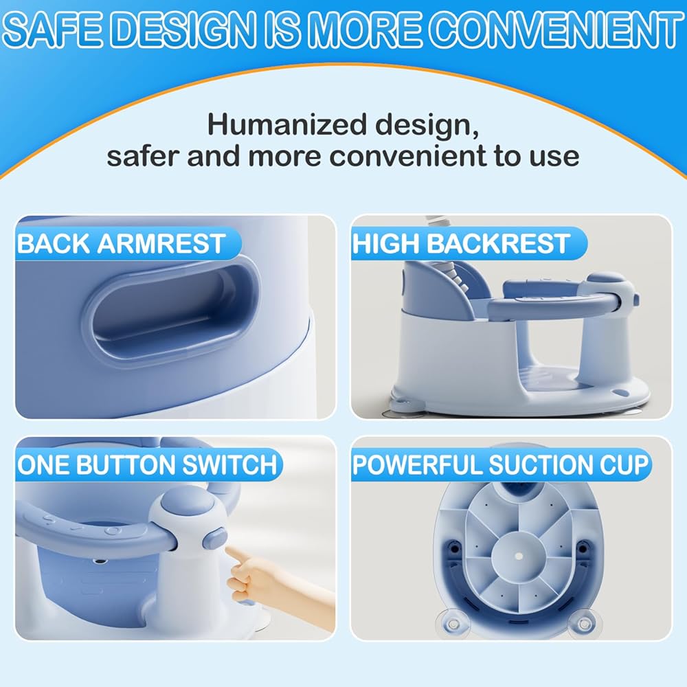 🛁 مريح وآمن مع كوب شفط قوي مانع للانزلاق - تم تصميم مقعد استحمام الأطفال هذا بوضعية جلوس مريحة، ويتميز بظهر مرتفع ومسند للذراعين لراحة طفلك. يضمن كوب الشفط القوي غير القابل للانزلاق الثبات، ويتم تثبيته بشكل آمن على أي سطح حمام أملس لتوفير تجربة استحمام آمنة.