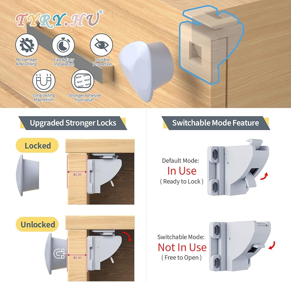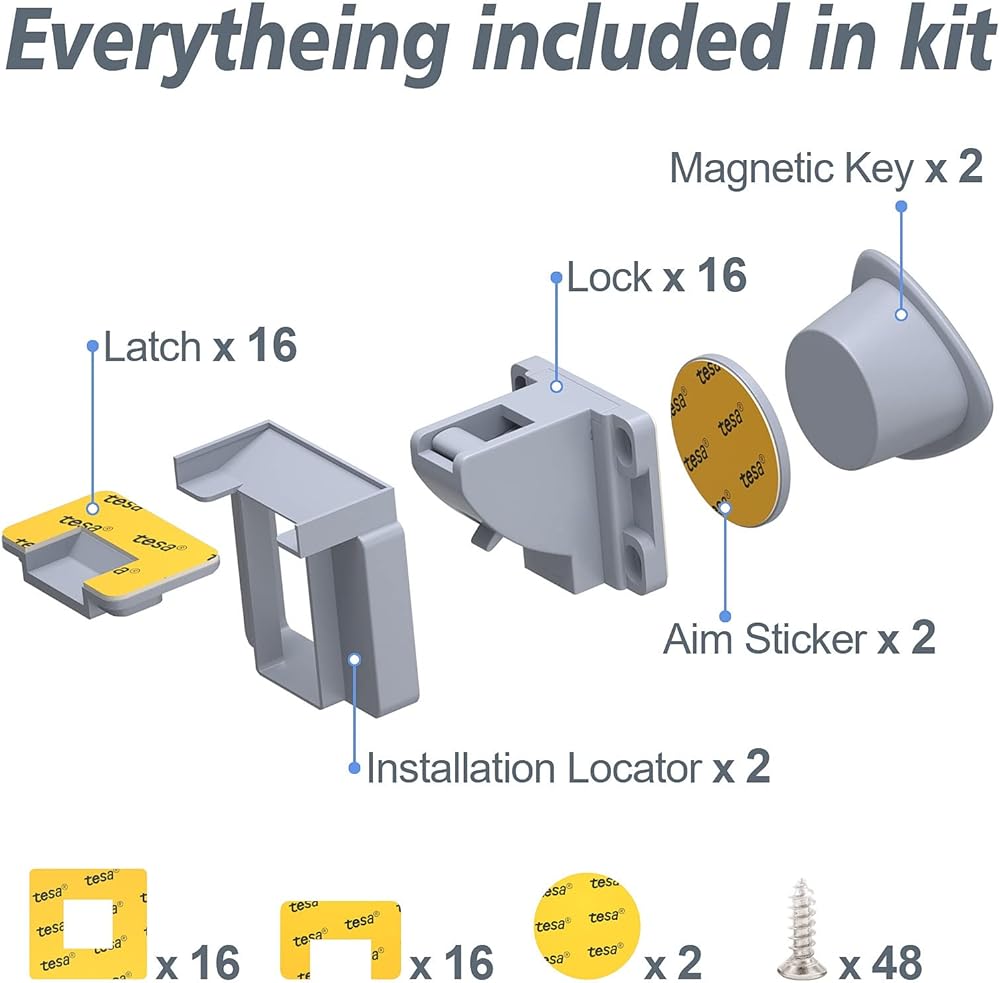 أقفال خزائن مغناطيسية لسلامة الأطفال من TYRY.HU (16 قفلًا + 2 مفتاح) لخزائن المطبخ والأدراج، أقفال أمان للأطفال غير مرئية مع مفتاح - لا تحتاج إلى حفر أو أدوات، سهلة التركيب