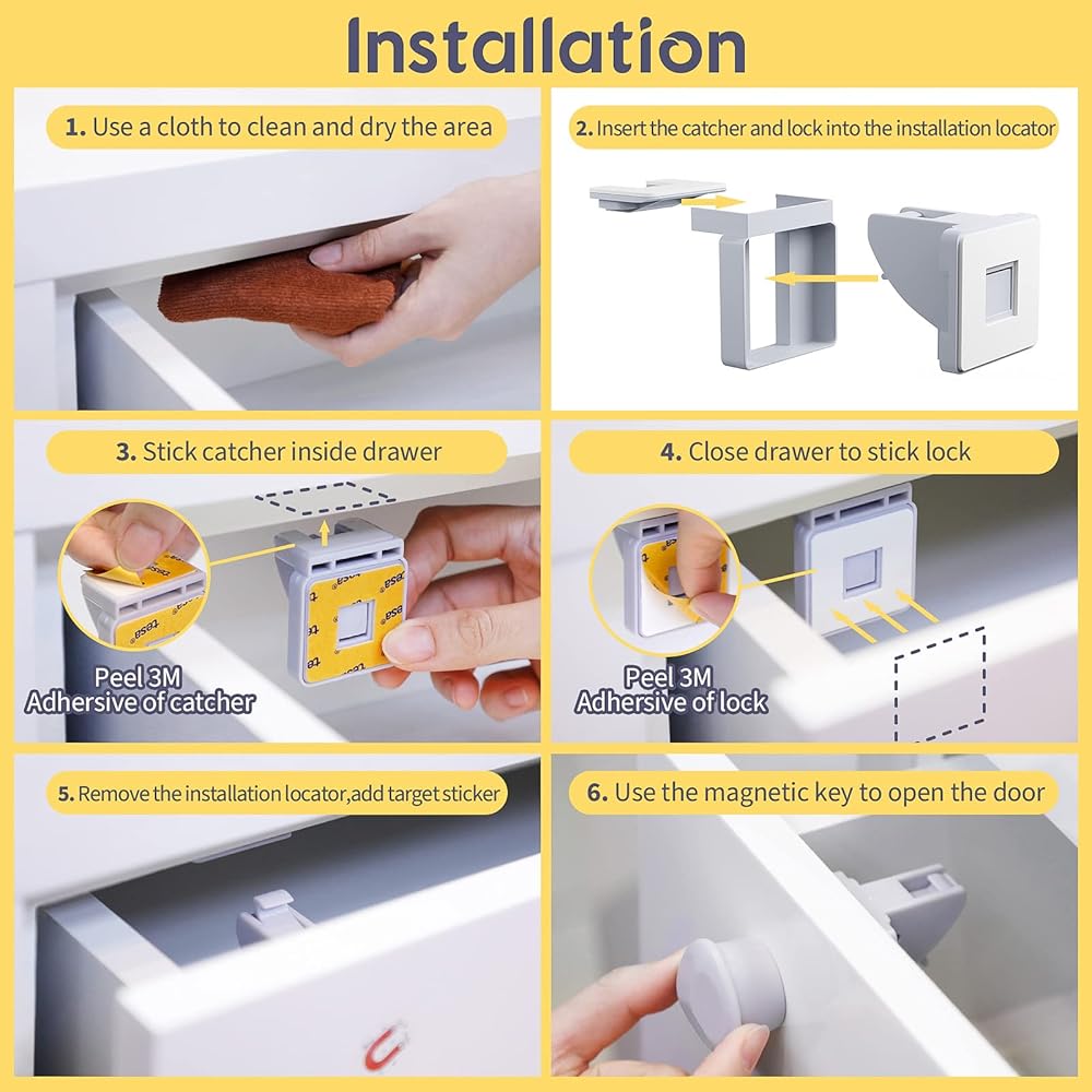 💯【سهلة التركيب 】: لا حاجة للحفر أو الأدوات! تنبيه: اضغط لأسفل على الزر لإيقاف القفل قبل التثبيت. ما عليك سوى القياس واللصق والتأمين على الخزانة أو الدرج في دقائق. قمنا أيضًا بإعداد فيديو تثبيت للرجوع إليه. إذا كانت لديك أي أسئلة حول مجموعة أقفال الخزانة المغناطيسية، فلا تتردد في الاتصال بنا للحصول على حل مرضي.