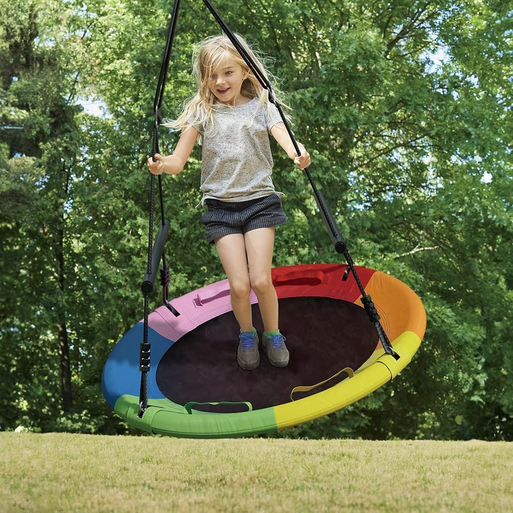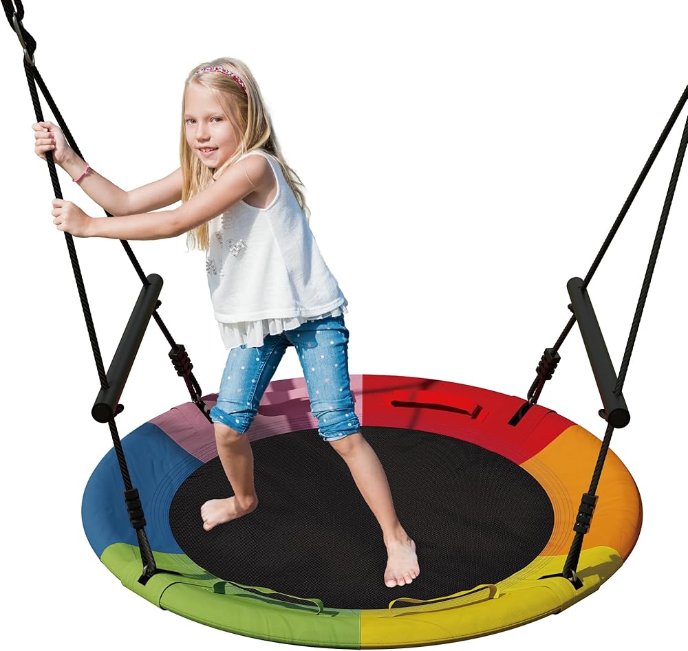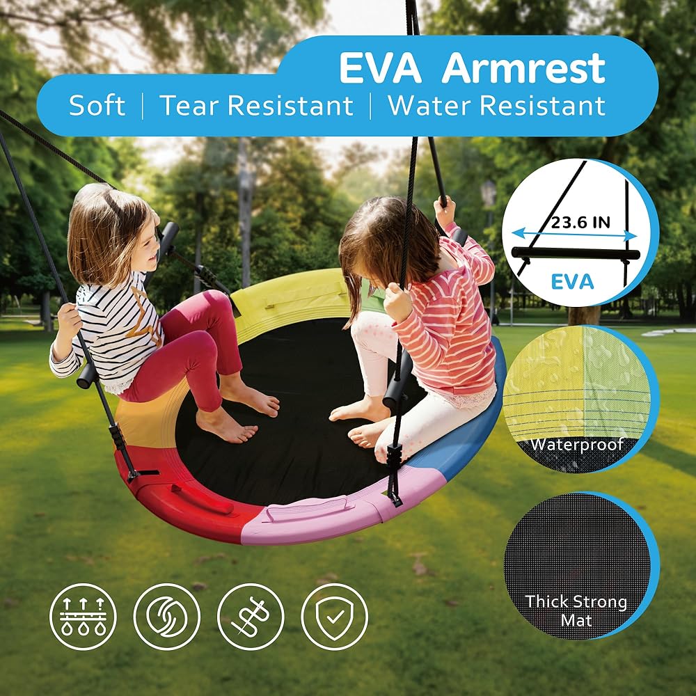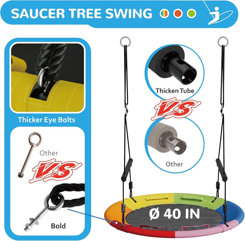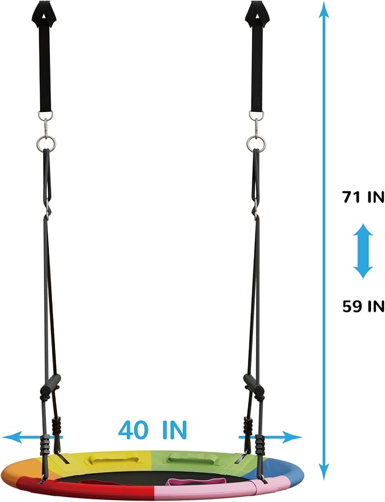 • صحن متأرجح كبير: اجمعوا حولكم للاستمتاع في الفناء الخلفي مع مجموعة التأرجح عالية الجودة هذه! مصنوع بإطار فولاذي قوي مقاس 40 بوصة ومقعد أكسفورد منسوج بإحكام، وهو يحمل بأمان العديد من الأطفال أو البالغين، ويدعم ما يصل إلى 800 رطل. يتيح الشكل الدائري الواسع سهولة الدخول والخروج. بفضل تصميمها الواسع ومتانتها الفائقة، فإن هذه الأرجوحة الخارجية تدعوك لساعات من اللعب في المنزل. الآن يمكن لجميع أفراد العائلة الاستمتاع بالملعب الكلاسيكي في الفناء الخلفي الخاص بهم!