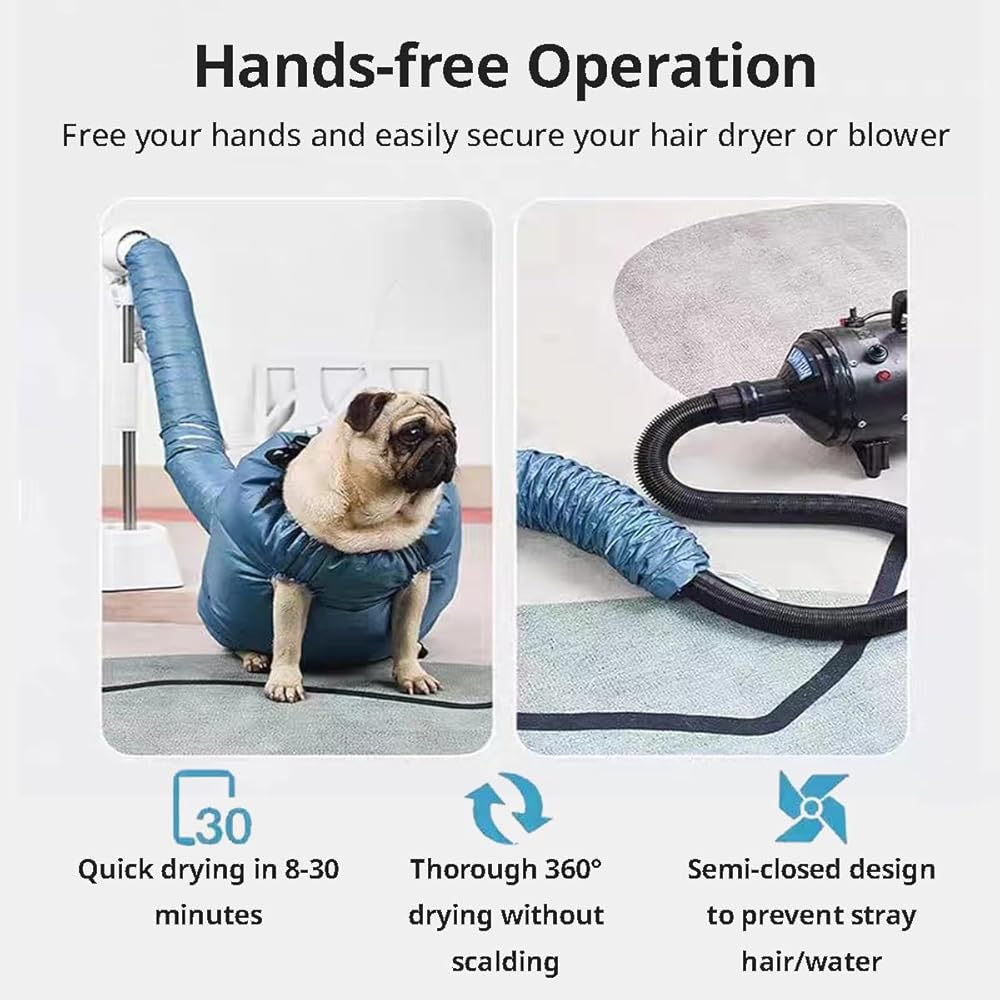 فعالة وموفرة للوقت: مع وقت تجفيف سريع يتراوح من 8 إلى 30 دقيقة، تقوم حقيبة المجفف الخاصة بنا بتدوير الهواء بالتساوي، مما يضمن تجفيفًا شاملاً دون التعرض لخطر الحروق. التصميم شبه المغلق يمنع الشعر والماء من التناثر، مما يجعل روتين العناية بحيوانك الأليف أمرًا سهلاً.