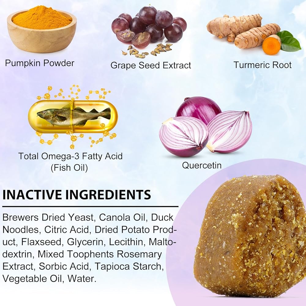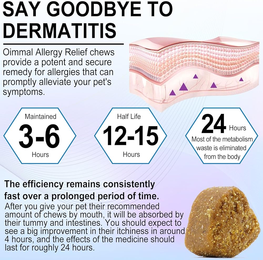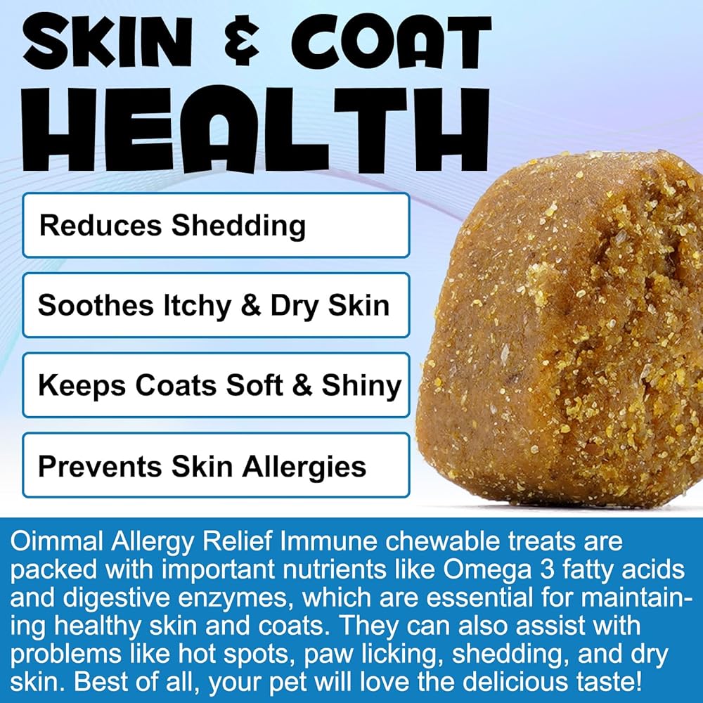 بشرة ومعطف أكثر صحة: تخفيف الحساسية الطبيعية للكلاب التي تعاني من حكة الجلد مع 0 ميجا 3 من الأحماض الدهنية (زيت السمك) لدعم نظام مناعة أكثر صحة والجلد والفراء أكثر صحة، هذه المضغ لتخفيف الحكة مناسبة لجميع السلالات والأعمار.