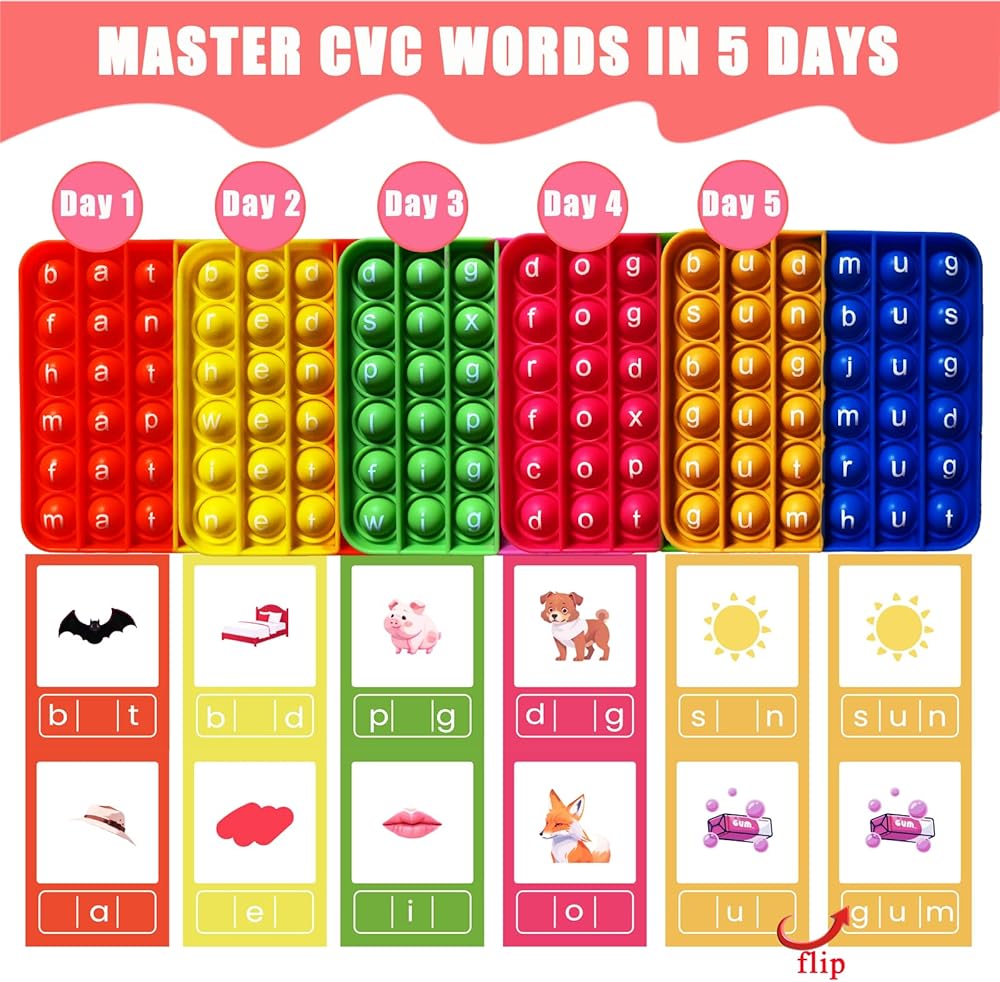 【لوحة فقاعات الكلمات CVC: تعلم وتهجئة بسهولة】 هذه اللوحة ضرورية لتعليم أساسيات القراءة. مع 96 كلمة CVC، 60 مرتبة حسب تسلسل حروف العلة للممارسة المركزة و36 كلمة مختلطة لتقييم الإتقان، إنها أداة رئيسية لتعزيز الصوتيات ومهارات القراءة والكتابة. إنها لعبة إبداعية للأطفال من سن 4 إلى 8 سنوات ولعبة ذكية للمتعلمين في وقت مبكر، بالإضافة إلى ألعاب التوحد للأطفال من سن 5 إلى 7 سنوات.